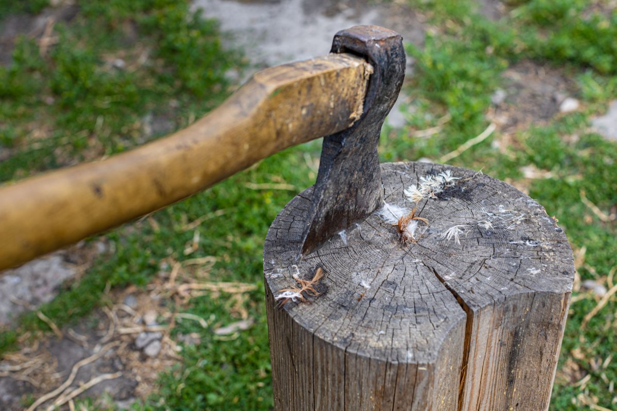 Муж отказался и позвал соседа. Я наблюдала со стороны, думала, что просто посмотрю, как это делается, и в будущем справлюсь. Сосед взял курицу, положил на пень, одним движением топором. Быстро, чисто. Всё профессионально. Я решила, что в этом нет ничего сложного.