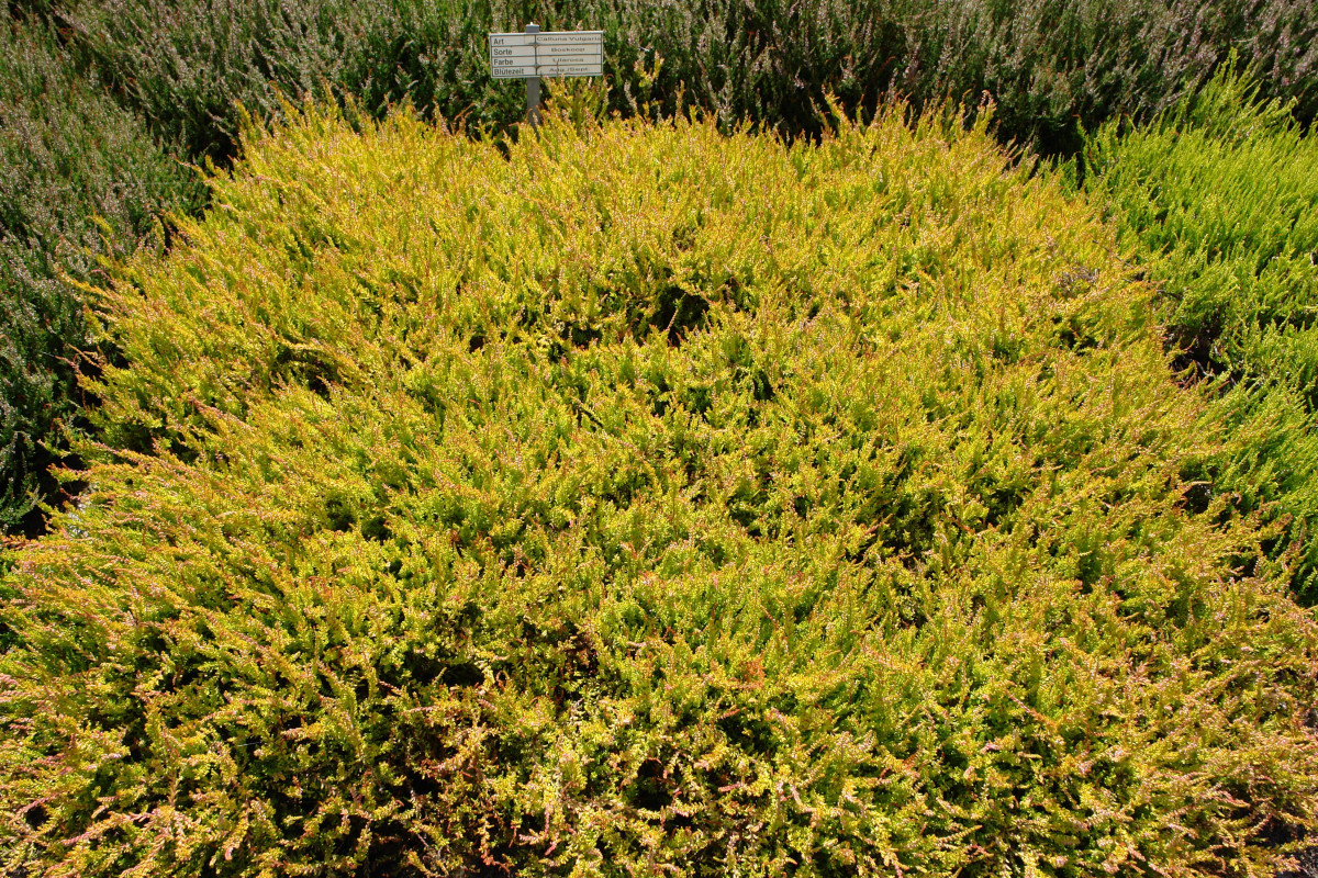 Летом он золотисто-желтый, а в холодное время – коричнево-красный. Благодаря такой окраске листвы вереск отлично смотрится рядом с сортами других окрасок, а также с хвойными, эффектно подчеркивая их великолепие.