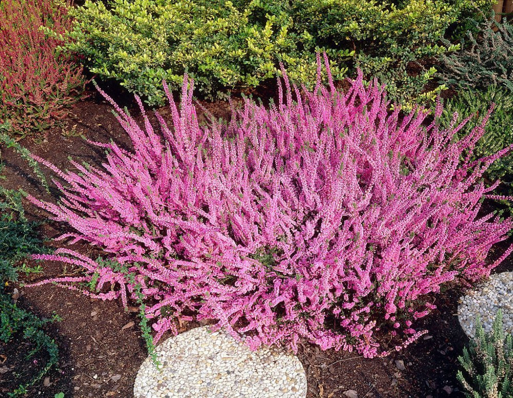 Хорошо сочетать вереск с хвойными: туями, можжевельниками, тсугами, карликовыми соснами и другими, чтобы получить стильную вечнозеленую клумбу и придать ей цветовых акцентов. Добавить композиции еще большей декоративности в весеннее время года можно при помощи низкорослых луковичных. Также в такую компанию отлично впишется рододендрон.