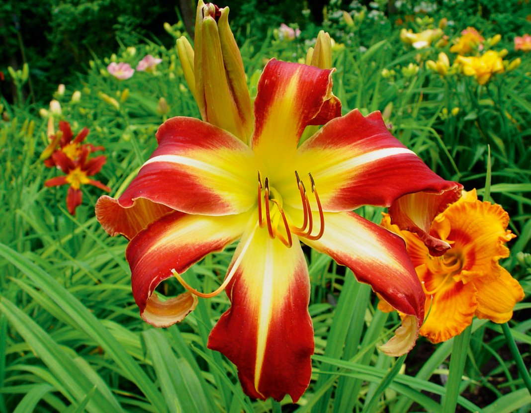И хотя лилейники — не те многолетники, которые способны цвести весь сезон, с весны и до осени, но и того летнего шоу, которое устраивают сортовые лилейники с июня и до сентября, вполне хватает, чтобы считать их главными красивоцветущими многолетниками. Большинство современных лилейников – растения ремонтантные, способные цвести повторно. Несмотря на то что период цветения каждого сорта продолжается от 4 до 8 недель (за редким исключением последних гибридов, цветущих дольше обычного), выбор сортов с ранним, средним и поздним стартом цветения позволяет создать эстафету из лилейников и растянуть общее цветение на три и более месяца.