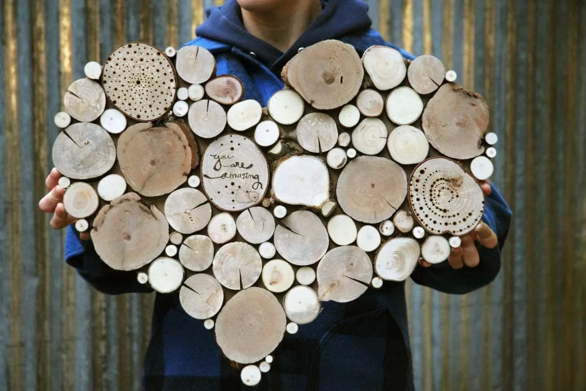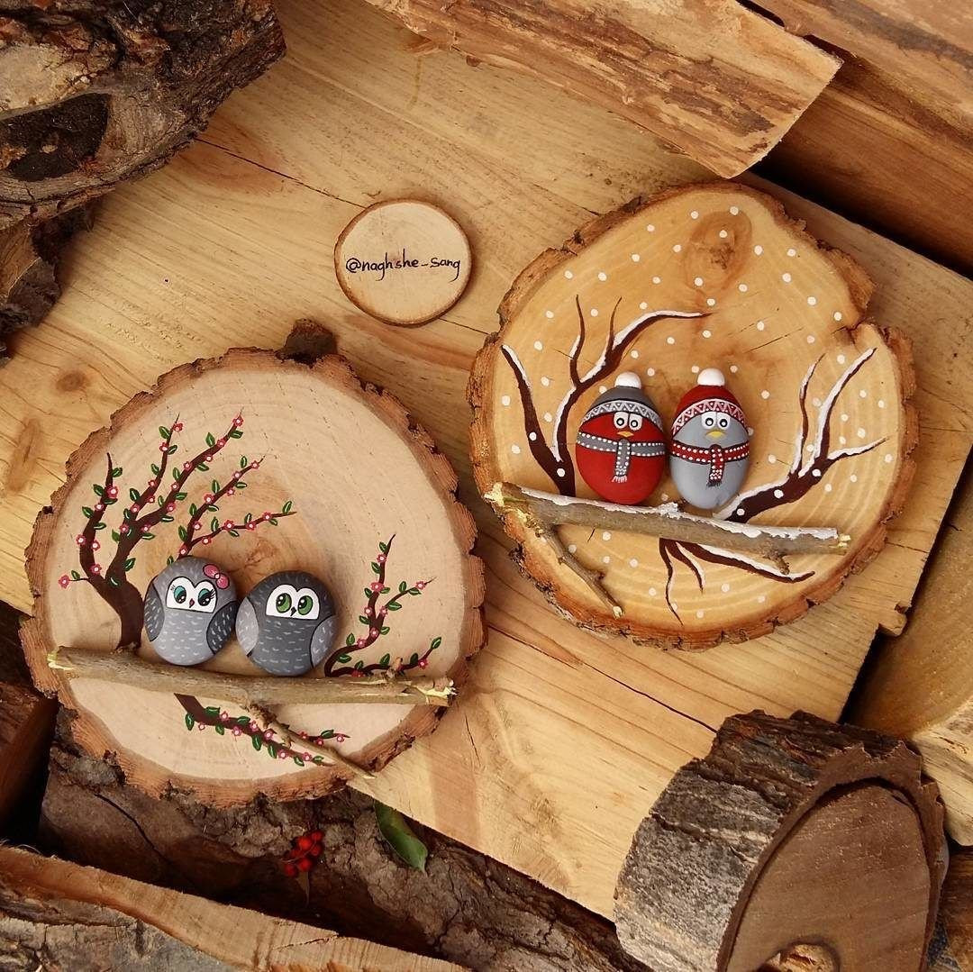 Очень милые и компактные поделки, выполненные на срубе. Это может быть как разрисованная пластинка, так и объемная аппликация. Кстати, такие «кружочки» можно использовать даже в качестве украшений — например кулона или сережек. А если их много, то можно составить целое панно!