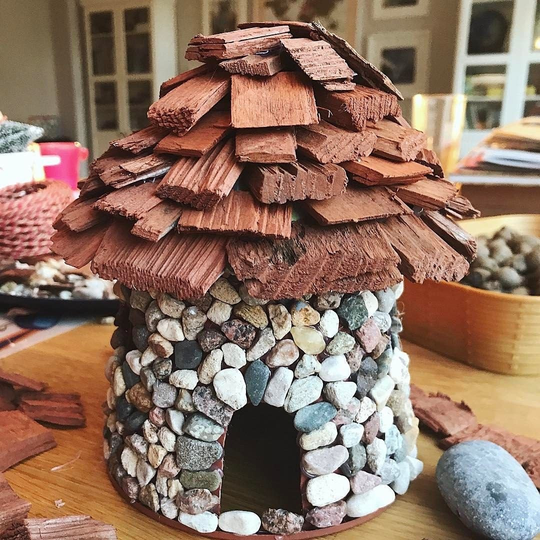 Я выбрала для поделки простой круглый домик с камешками. Внучка соберет камешки (на даче дорожки отсыпаны гравием), поможет приклеить. Вместе в лесу наберем мха для «земли», сделаем вместе гномиков из шишек. Да, 70% работы сделаю я, но участие внучки тут будет достаточное, чтобы сказать, что это ее поделка.