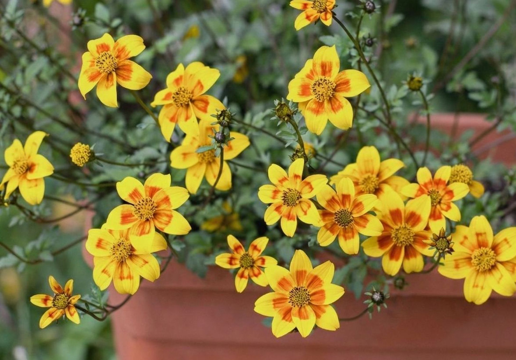 Биденс – усыпана солнечными жёлтыми ромашками на фоне ажурной зелени. Биденс цветёт без остановки, не требует обрезки отцветших цветков, быстро растёт и заполняет объём. Он засухоустойчив и вынослив, идеален для занятых людей.
