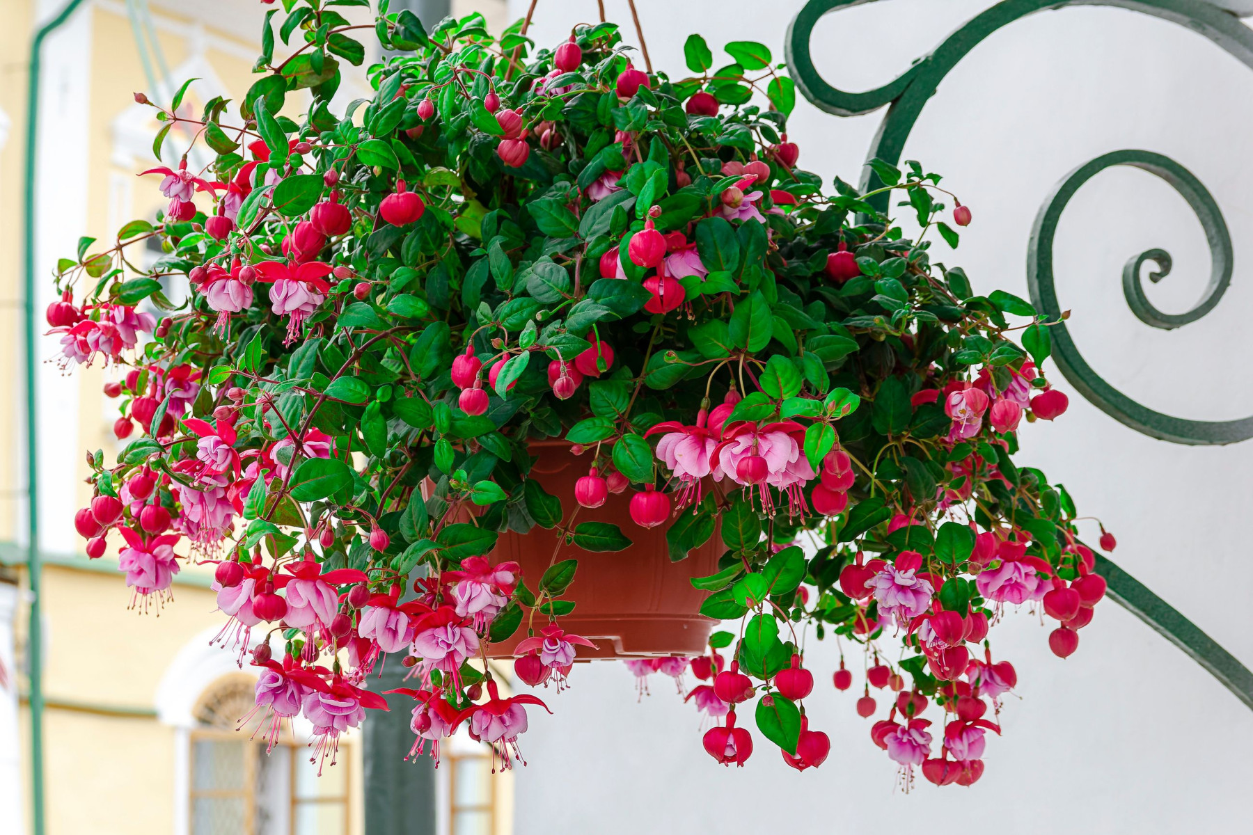 Фуксия – настоящая королева теневых кашпо. Её поникающие цветки-фонарики выглядят экзотично и изысканно, как будто это не растение для фасада, а что-то из оранжереи викторианской эпохи. Фуксия любит прохладу и влагу, на жаре вянет и страдает, а вот в полутени чувствует себя прекрасно. «Когда повесила фуксию под навес у входа, гости стали спрашивать, где я её купила, – делится знакомая. – Думали, что это какое-то редкое растение».
