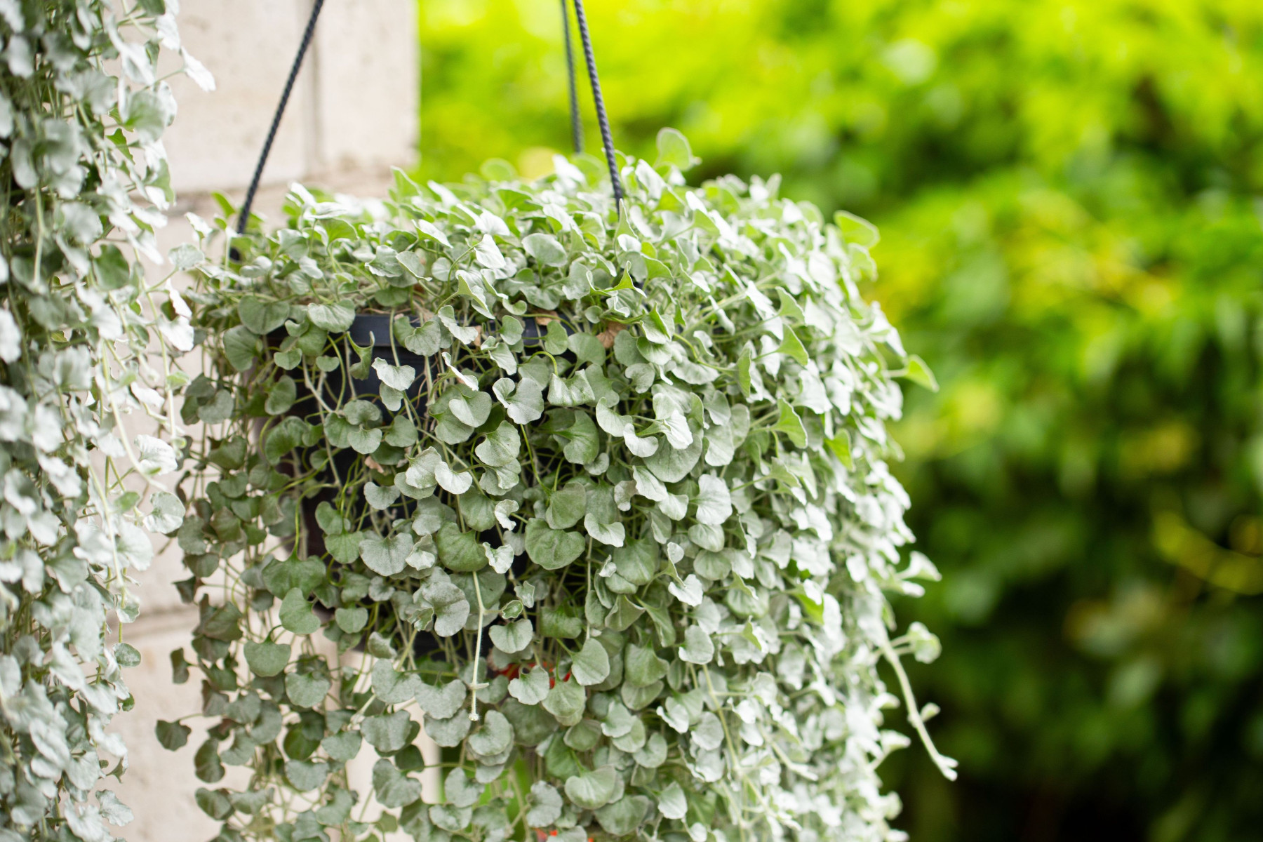 Дихондра серебристая – это растение вообще не про цветы, а про зелень, но какую! Длинные, до полутора метров, побеги с круглыми серебристыми или зелёными листочками создают эффект живого водопада. Дихондра идеальна для полутени, неприхотлива, быстро растёт и отлично сочетается с цветущими видами.