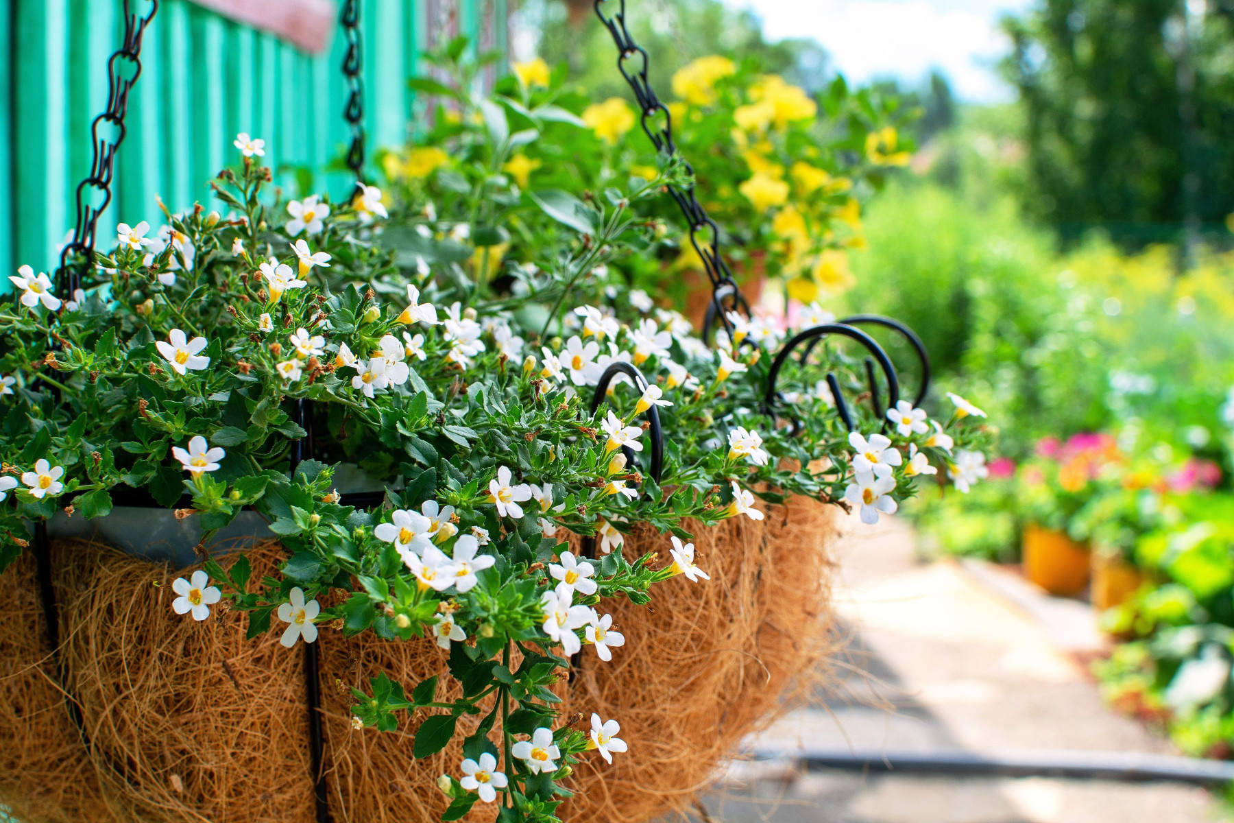 Бакопа – выглядит изящной и скромной. Мелкие белые или розовые цветочки усыпают длинные побеги, которые элегантно свисают из кашпо. Бакопа отлично чувствует себя в полутени, не боится дождей, цветёт волнами весь сезон. Её часто используют как фоновое растение в смешанных композициях, и она прекрасно справляется с этой ролью, не перетягивая на себя внимание.