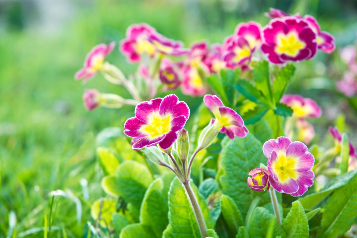 - Примула обыкновенная (Primula vulgaris) с жёлтыми, розовыми, белыми цветками