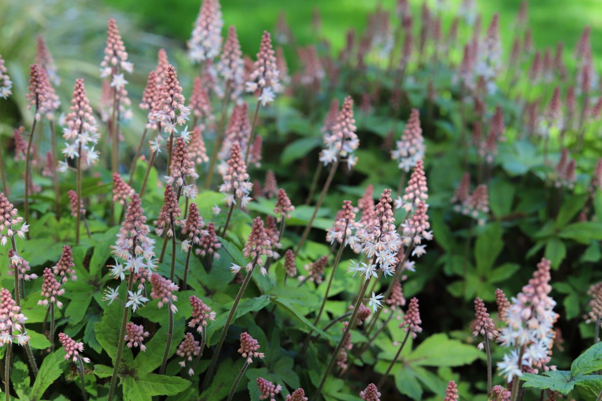 - «Пинк Скирлет» (Tiarella ‘Pink Skyrocket’) с розовыми соцветиями