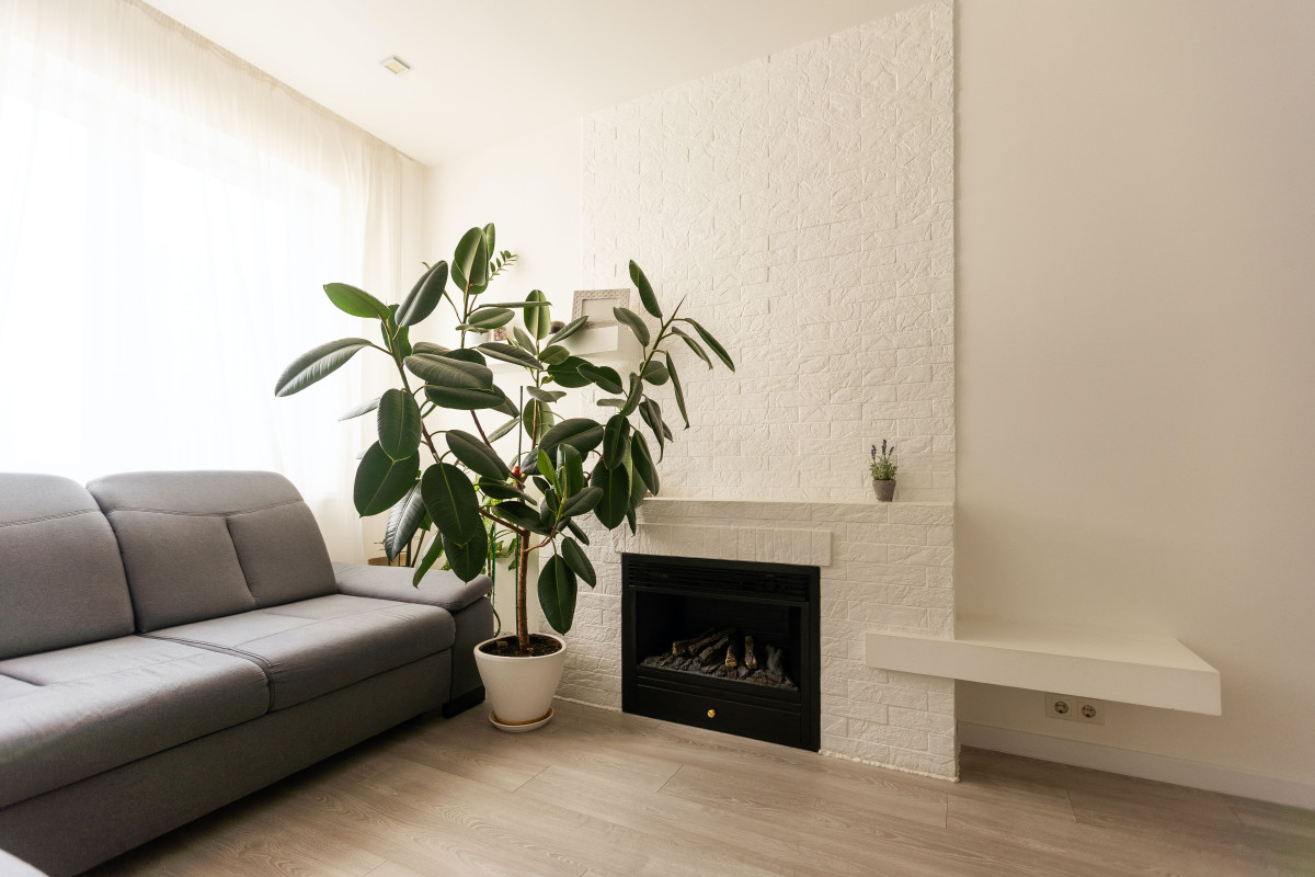 Фикус — это строгое растение с крупными глянцевыми листьями. Он выглядит графично, почти архитектурно, и его присутствие упорядочивает комнату. Гладкие листья легко протирать от пыли — просто раз в неделю прошлись влажной тряпкой.