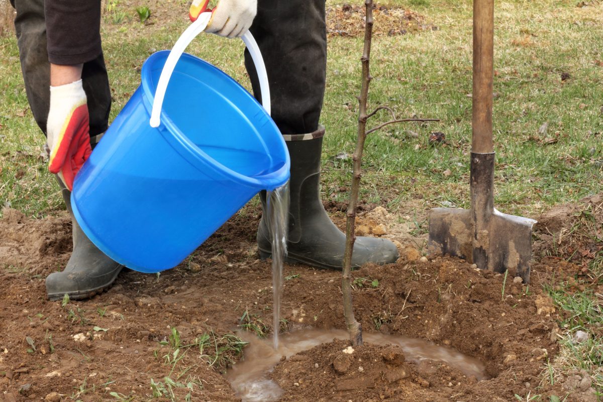 В первые 3 недели саженцы поливают в сухую погоду дважды в неделю, промачивая почву на глубину не менее 50 см. Далее раз в неделю, выливая под каждое растение 2-3 ведра. Вообще, нужно ориентироваться по погоде и времени года. Летом в жару в год посадки поливы должны быть самыми обильными и проводят их только тёплой, отстоявшейся водой. В сильные дожди нет смысла заливать растения. Поздней осенью, когда сад готовится к зиме, также избыточные поливы не нужны. Не забывайте после «водных процедур» мелко рыхлить приствольный круг, чтобы на земле не образовывалась корка.