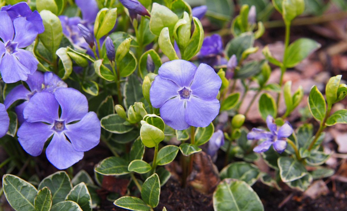 Это стойкий и некапризный вариант для участков с проблемными глинистыми почвами. Рекомендуется высаживать растения на расстоянии 30 см друг от друга и обрезать края по мере необходимости для контроля разрастания. Цветение происходит в период с апреля по май, с возможным повторением в августе и сентябре, что делает барвинок особенно ценным для пчел.