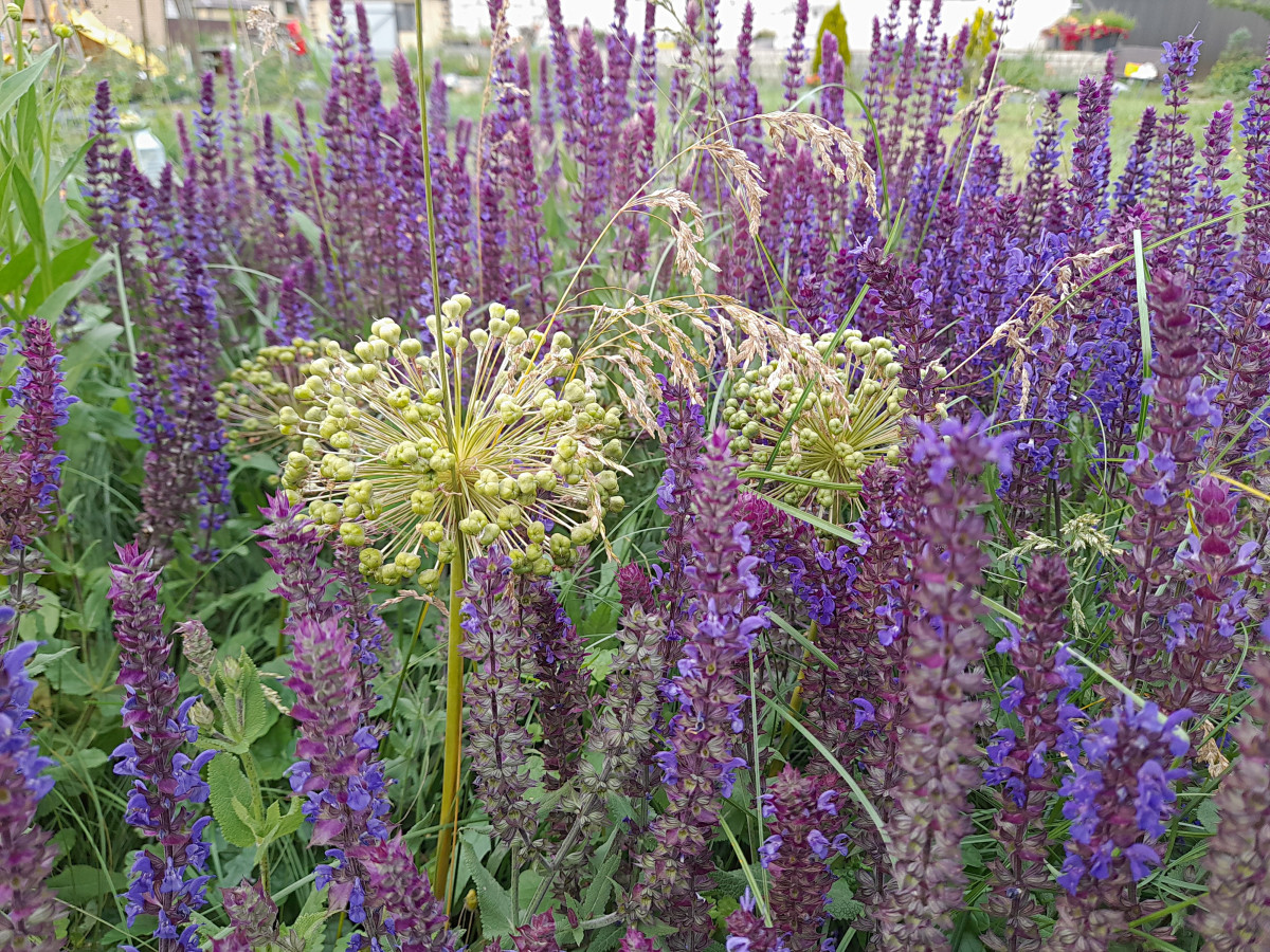 Я не удаляю отцветшие головки этого лука. Они сохраняют свою структуру и даже после цветения хорошо сочетаются с шалфеем в качестве архитектурного элемента.