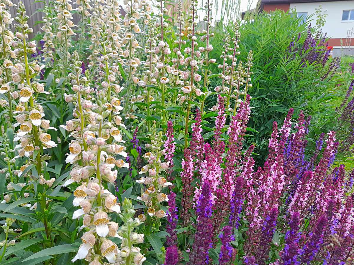 В прошлом году я вырастила из семян относительно редкий вид наперстянки, и теперь она зацвела. В отличие от более известной наперстянки пурпурной, это многолетник, а не двулетнее растение, и она очень хорошо смотрится в природном цветнике. Хотя оба цветка имеют колосовидные соцветия в виде шпиля, они хорошо подходят друг другу благодаря расцветке. Нежная наперстянка кофейного оттенка очень освежает темно-фиолетовый шалфей и оттеняет его.