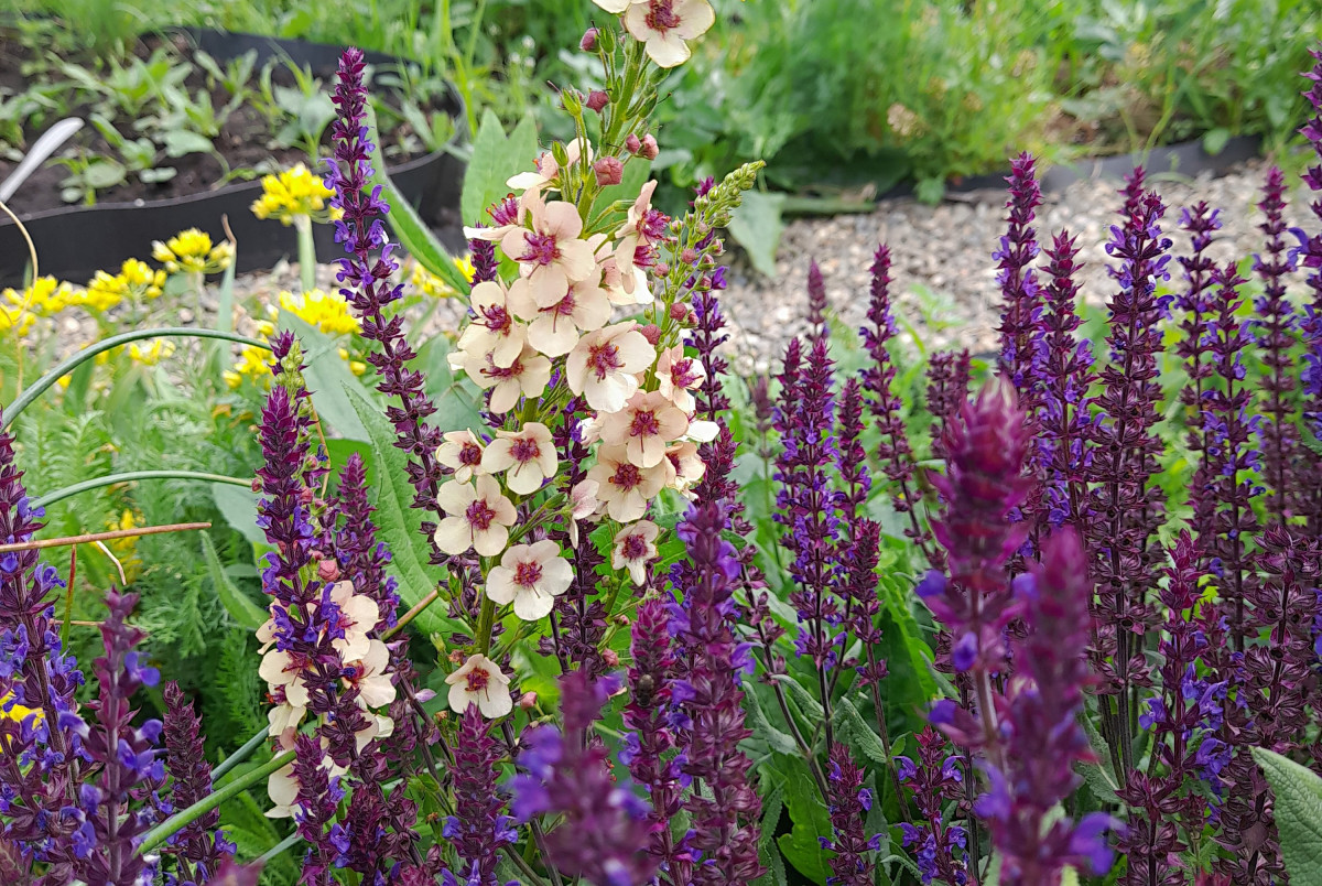 Это сочетание я подсмотрела в природе. Однажды на лугу мне попалась куртина шалфея рядом с коровяком и смотрелось это просто невероятно. Позже я вырастила смесь гибридного вербаскума «Саузерн Шарм» и посадила его рядом с шалфеем дубравным. Некоторые экземпляры оказались очень красивого соломенного оттенка и создали прекрасный дуэт с шалфеем. Хотя коровяк гораздо выше этого цветка, вместе они смотрятся очень гармонично.