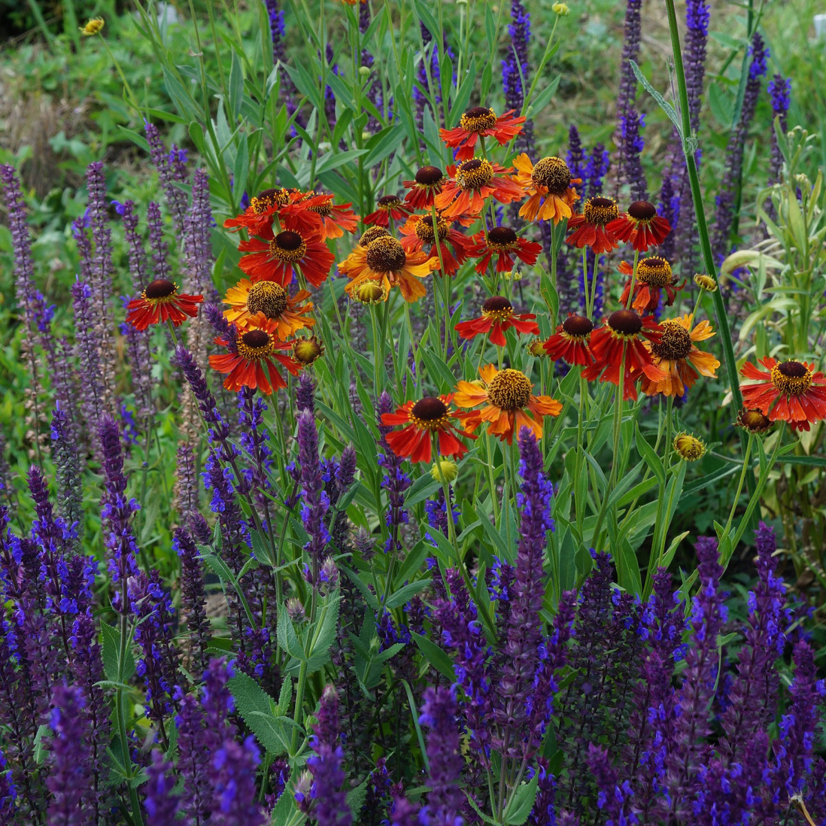 Современные гибриды гелениума очень сложно назвать осенними. Сорт «Рубинцверг» зацветает очень рано. В моем цветнике его цветки можно увидеть уже в середине июня, когда до осени еще очень далеко. Этот гелениум не очень высокий и лишь немного выше шалфея. Кустики «Рубинцверга» очень рыхлые и его цветочки живописно парят над куртинами шалфея. Цветение обоих длительное и эта парочка остается вместе до осени.