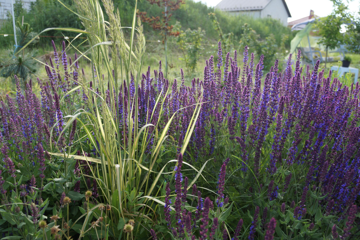 Шалфей распускается, когда у гравилата доцветают последние цветки. Сочетание получается довольно ярким, но по-природному нежным. После цветения я не обрезаю головки гравилата и его милые репейнички продолжают поддерживать шалфей.