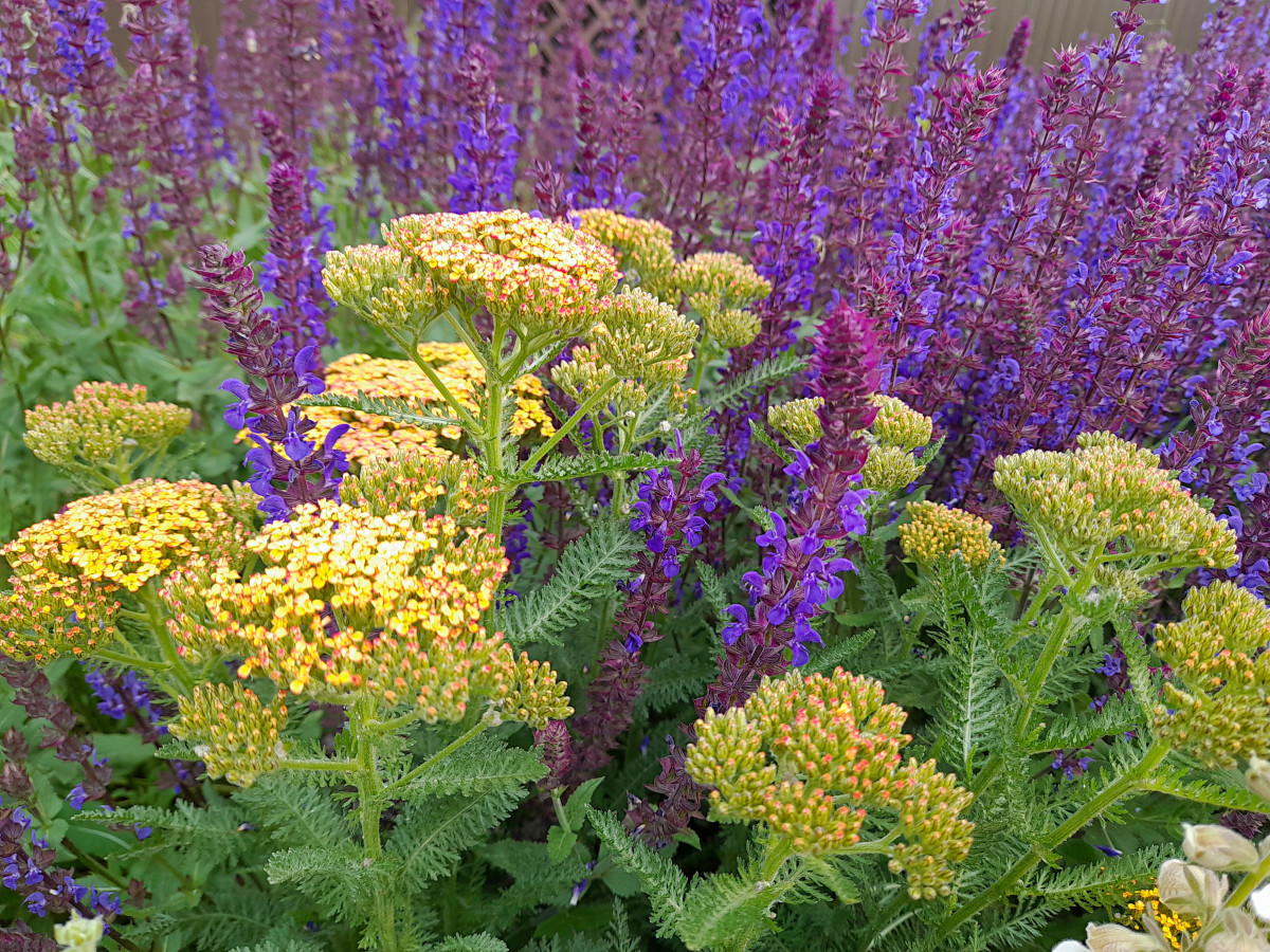 Это растение еще один хороший вариант для создания контраста между горизонталью и вертикалью. У ахиллеи горизонтальные щитковидные соцветия, которые станут отличной плоскостью для того чтобы подчеркнуть вертикальные шпили шалфея дубравного. Цветовая гамма тысячелистника также великолепно подходит шалфею практически в любой вариации. У ахиллеи можно найти различные оранжеватые, желтоватые, бардовые и лиловые тона и все они замечательно сочетаются с фиолетовым.