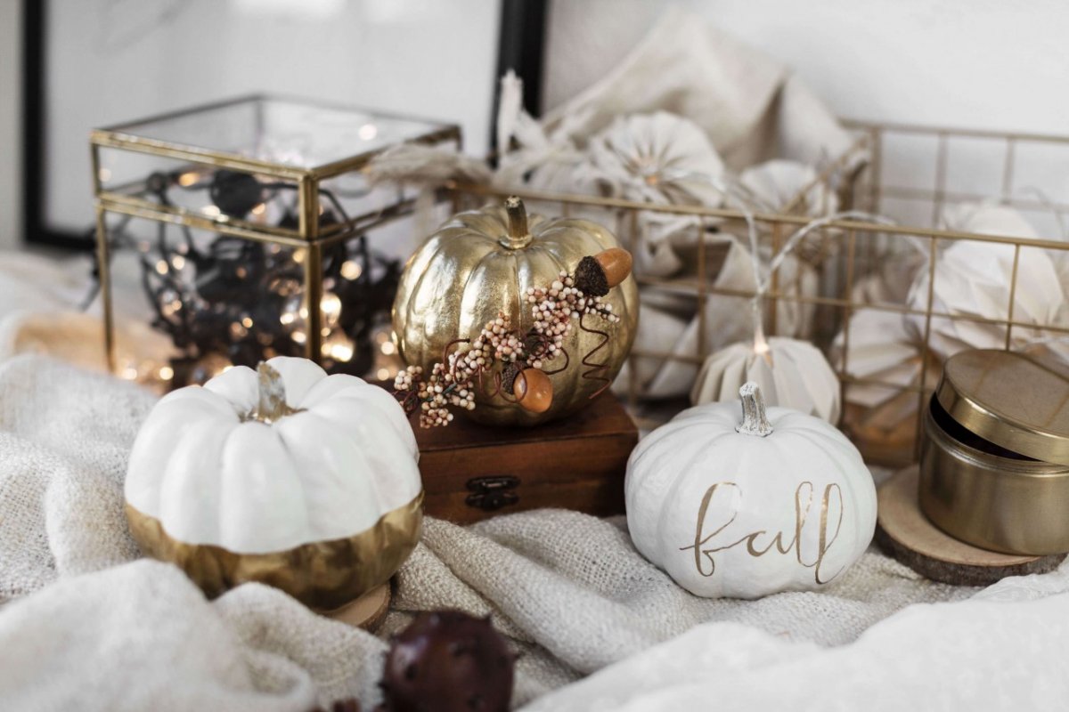 Изысканно смотрятся также тыквы, украшенные стразами, особенно белые. А самое простое решение — покрасить тыквы золотой и серебряной краской, частями или полностью.