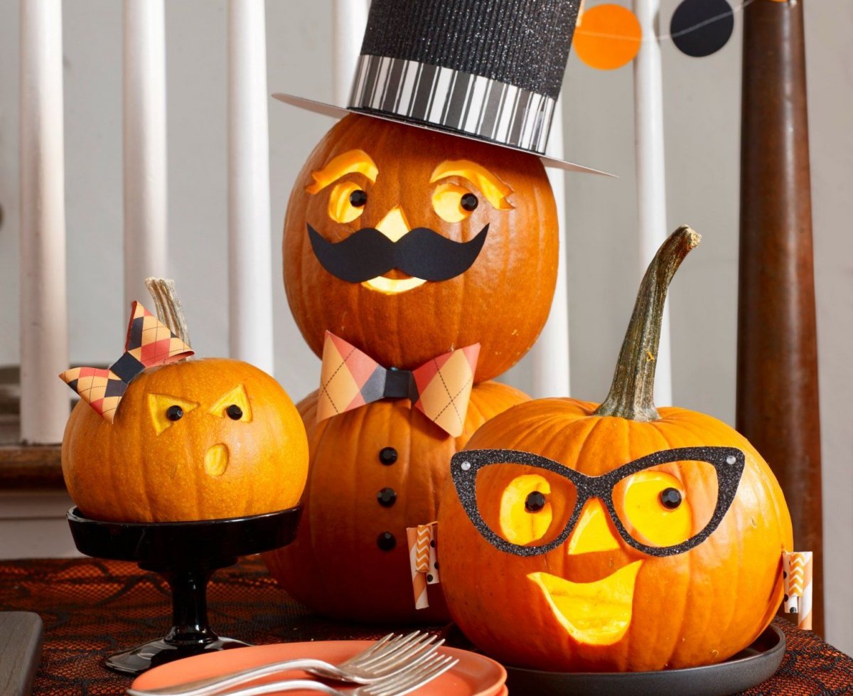 Очки, цилиндр и серьги придают этому семейству тыкв веселый вид. Подбирая детали и характерные черты себя и своих близкий, можно создать свой собственный семейный «портрет» из тыкв.
