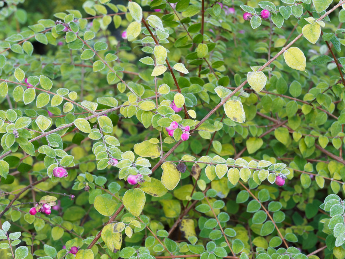 Низкий раскидистый кустарник с мелкими округлыми листьями и розовато-белыми ягодами, сохраняющимися до зимы. Цветет в июле мелкими розовыми цветками, привлекающими пчел. Осенью листва окрашивается в желто-оранжевые тона.