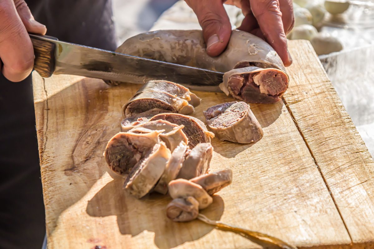 На вкус это жёсткое, волокнистое мясо с пугающе резким аммиачным послевкусием. Что-то среднее между рыбой и тухлятиной. Местные уверяют, что к третьему кусочку начинаешь привыкать, но для неподготовленного туриста дегустация обычно заканчивается на первой же попытке.