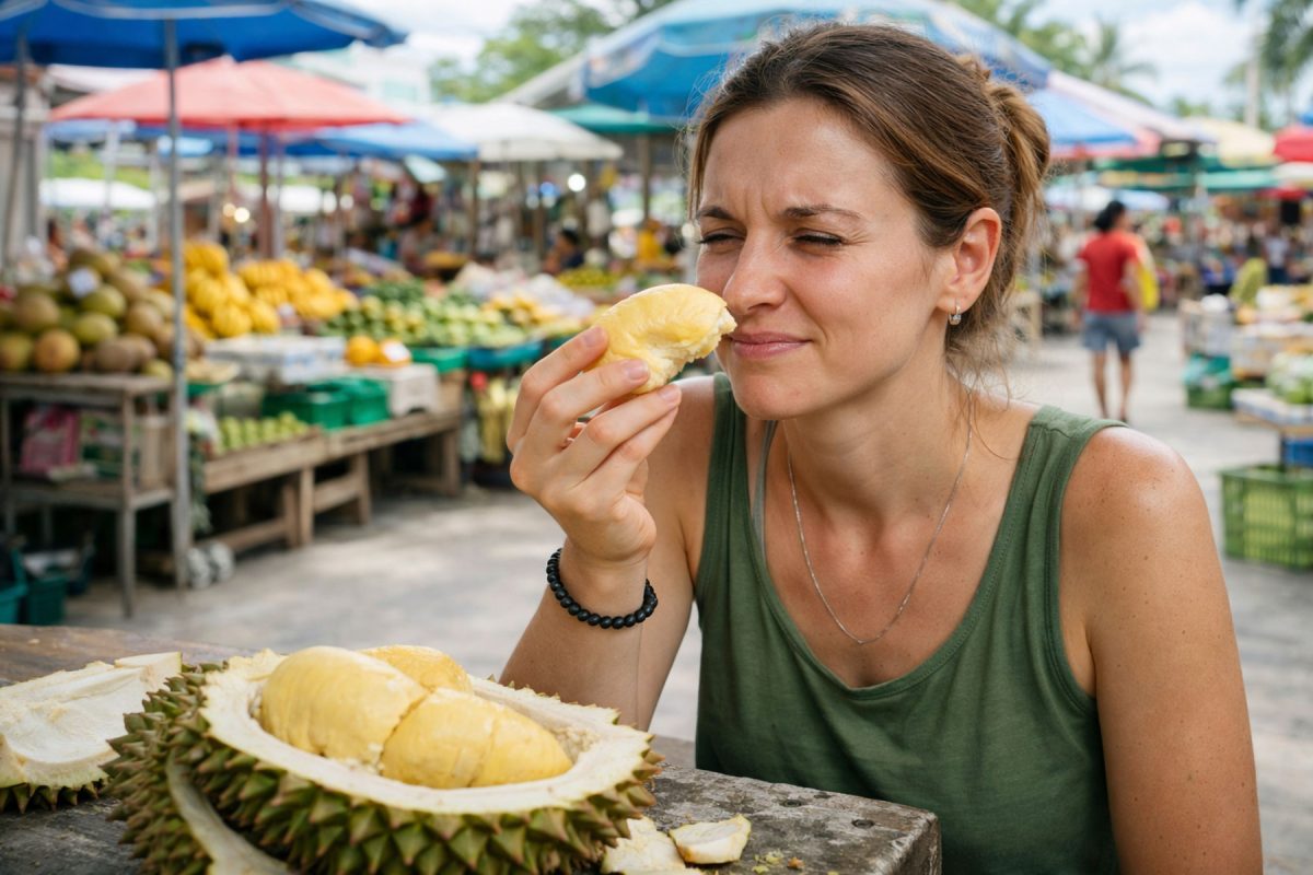 В Юго-Восточной Азии дуриан называют «королём фруктов». Он размером с футбольный мяч, покрыт шипами, и пахнет как смесь тухлого лука, скипидара и канализации. Запах настолько сильный, что с дурианом нельзя заходить в отели, лифты, такси, самолёты. Везде висят знаки: перечёркнутый дуриан.