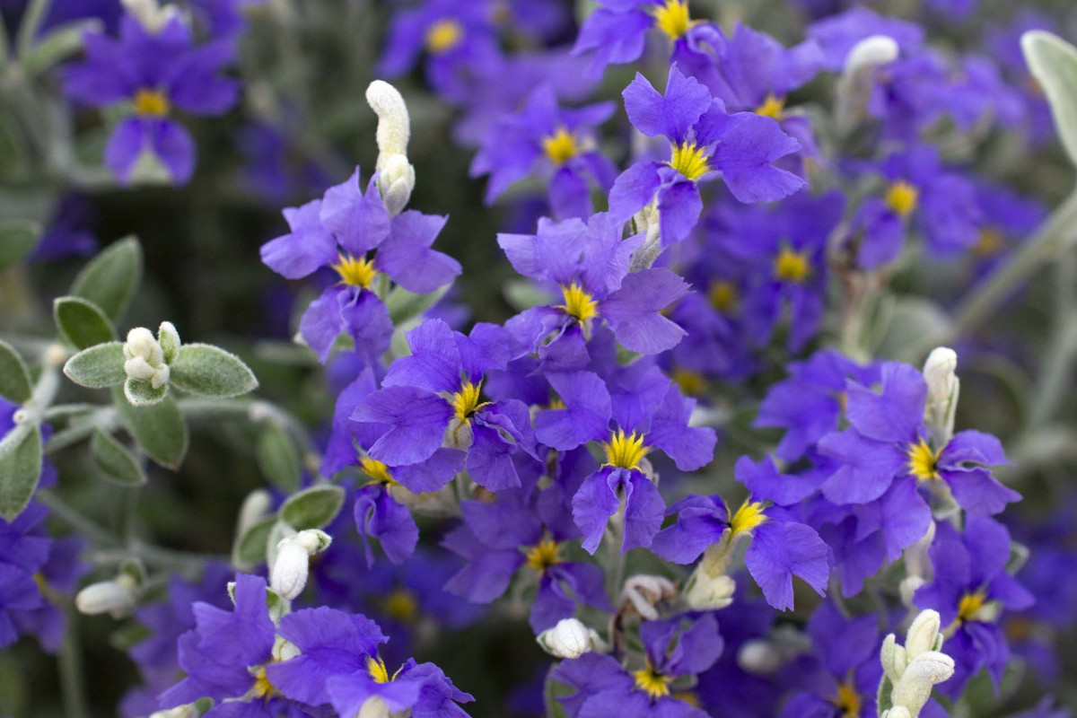 Дампиера – экзот из Австралии, который только начинает завоёвывать европейские сады. Дампиера «Перпл Оз» (Dampiera ‘Purple Oz’) выдаёт необычные цветки-веера насыщенного фиолетового оттенка. Растение засухоустойчиво, не боится жары и активно привлекает насекомых-опылителей.