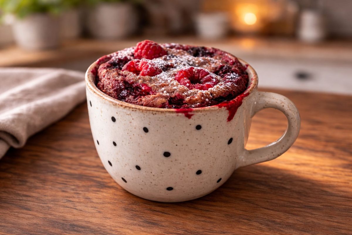 Горячий, пышный маффин, который выпекается прямо в вашей любимой кружке всего за пару минут. Отсутствие обычной белой муки делает его структуру чуть более плотной и влажной, а ягоды внутри лопаются при нагреве, пропитывая бисквит горячим кисло-сладким соком. Отличная тема для быстрого воскресного завтрака или внезапного желания съесть кусок пирога.
