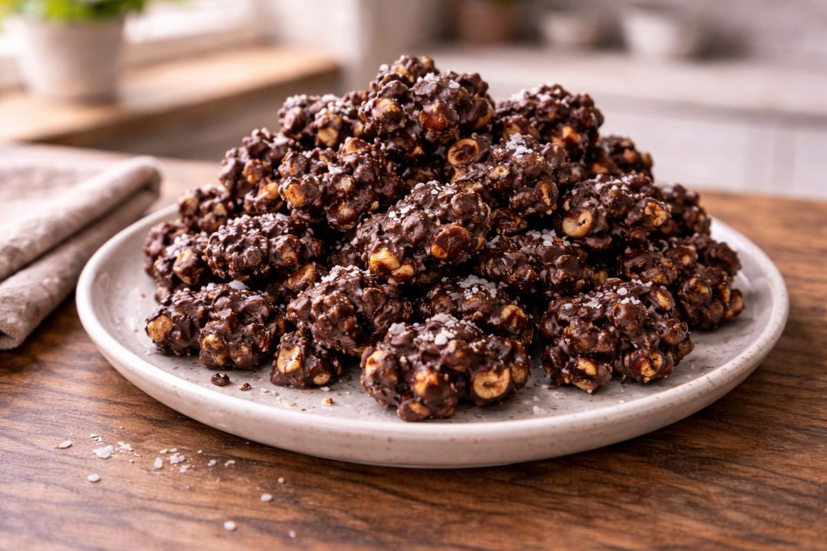 Как приготовить: Растопите шоколад в глубокой миске, засыпьте туда же попкорн с орехами и аккуратно перемешайте лопаткой, чтобы шоколад покрыл всё ровным слоем. Ложкой выложите массу небольшими кучками (кластерами) на тарелку, застеленную пергаментом, чуть присыпьте солью и закиньте в холодильник на 10 минут до полного застывания.