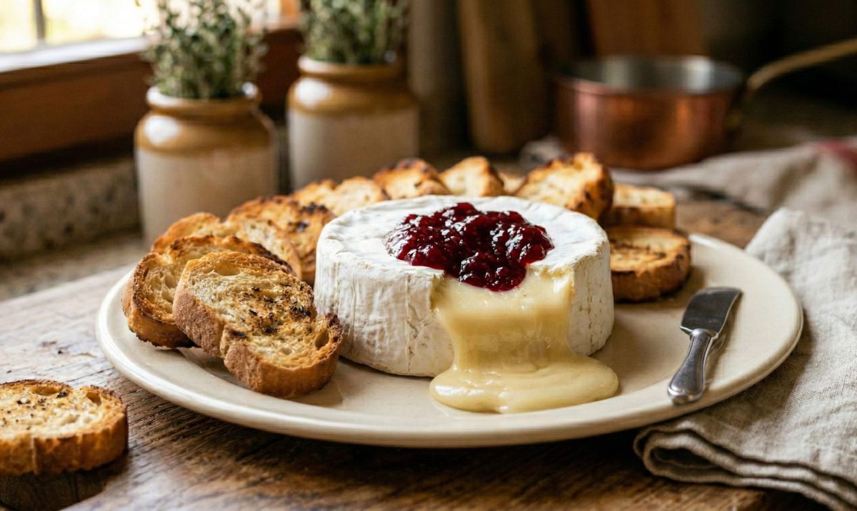 Элементарная, но невероятно эффектная штука. Горячий сыр с белой плесенью внутри превращается в тягучий сладко-солёный крем, который идеально сочетается с терпкостью ягодного или инжирного джема. В эту горячую лужицу макают всё, что хрустит, и это идеальный вариант для вечера с бокалом чего-нибудь интересного.