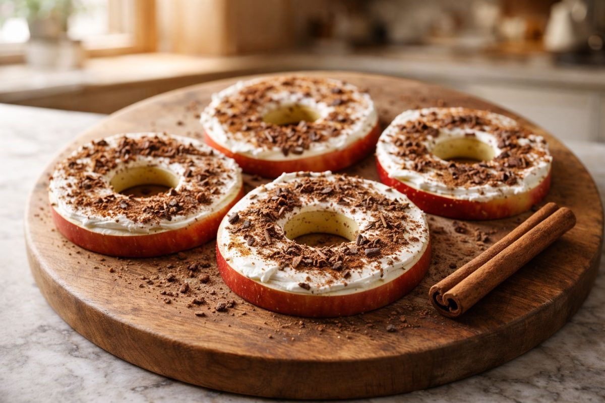 Отличный формат, когда хочется похрустеть чем-то сочным. Свежее яблоко здесь вместо тяжёлого теста, а плотная намазка из творожного сыра или ореховой пасты даёт сливочность. Корица с шоколадной крошкой сверху превращают это в настоящий десерт, хотя готовится всё за пару минут на разделочной доске.