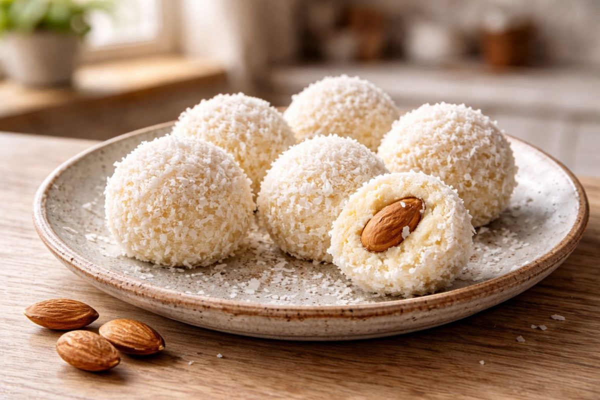 Очень простая домашняя версия знаменитых конфет без выпечки и лишнего жира. За счёт сухого молока или протеина шарики получаются плотными, с насыщенным сливочно-кокосовым вкусом, а спрятанный внутри цельный миндаль даёт тот самый фирменный хруст. Отличный вариант, когда хочется пожевать что-то сладкое и кокосовое, но покупные сладости кажутся слишком приторными.