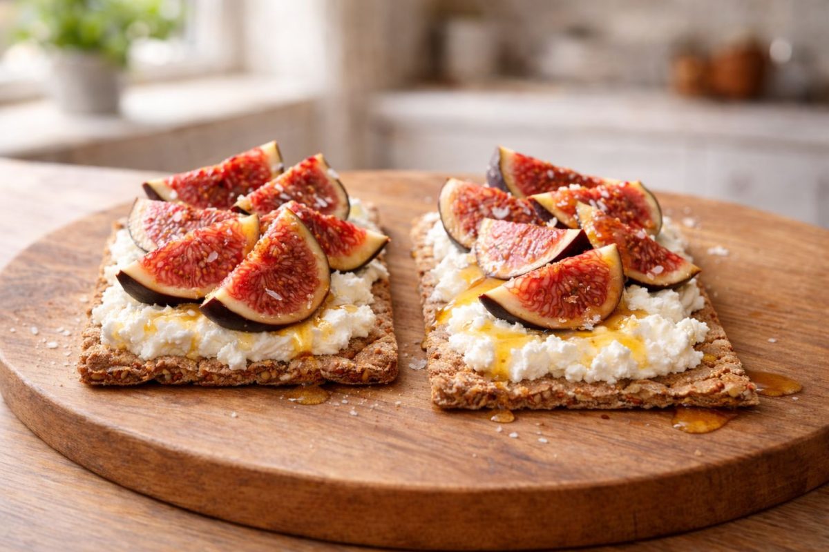 Требуется: качественные хрустящие хлебцы, сыр рикотта, свежий инжир (можно заменить на спелую грушу), жидкий мёд, хлопьевидная соль.