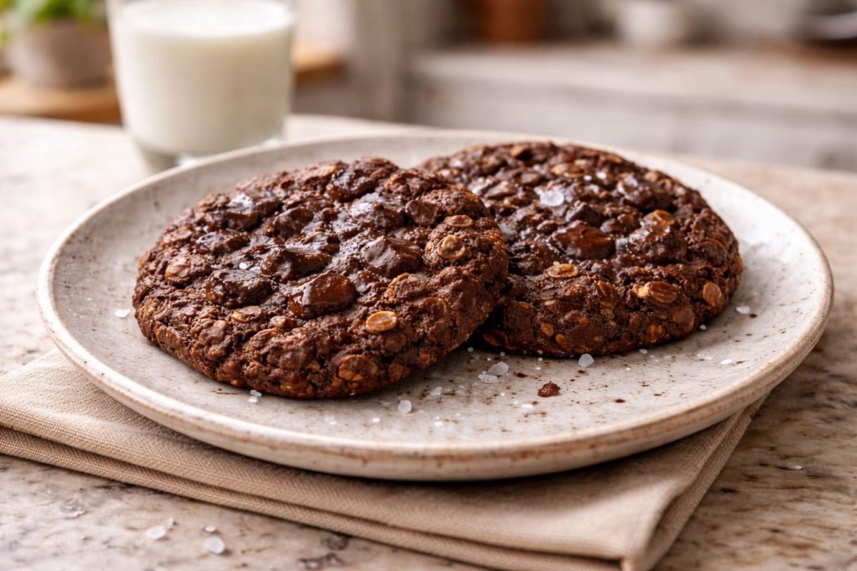 Спасение для тех моментов, когда дико хочется свежей домашней выпечки, но разогревать духовку и замешивать тесто категорически лень. Банан здесь связывает всё вместе, какао даёт плотный шоколадный цвет и аромат, а овсянка отвечает за текстуру. Печенье получается горячим, с лёгкой поджаристой корочкой снаружи и мягкой, слегка тягучей шоколадной серединкой.