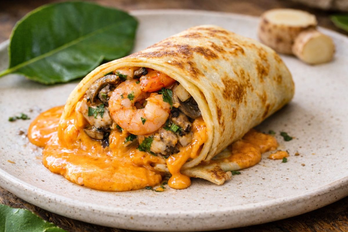 Как приготовить: Разогрейте сковороду с каплей масла. Выложите пасту Том-Ям и прогрейте её на среднем огне 1–2 минуты, постоянно помешивая. Это ключевой момент: паста должна зашипеть и раскрыть свой яркий аромат. Добавьте нарезанные грибы и обжаривайте их в этой пряной основе. Затем добавьте креветки и готовьте еще пару минут, пока они не станут розовыми. Снимите сковороду с огня, дайте начинке немного остыть и вмешайте в неё творожный сыр, превращая всё в густой, ароматный соус. Выложите на блин и заверните.