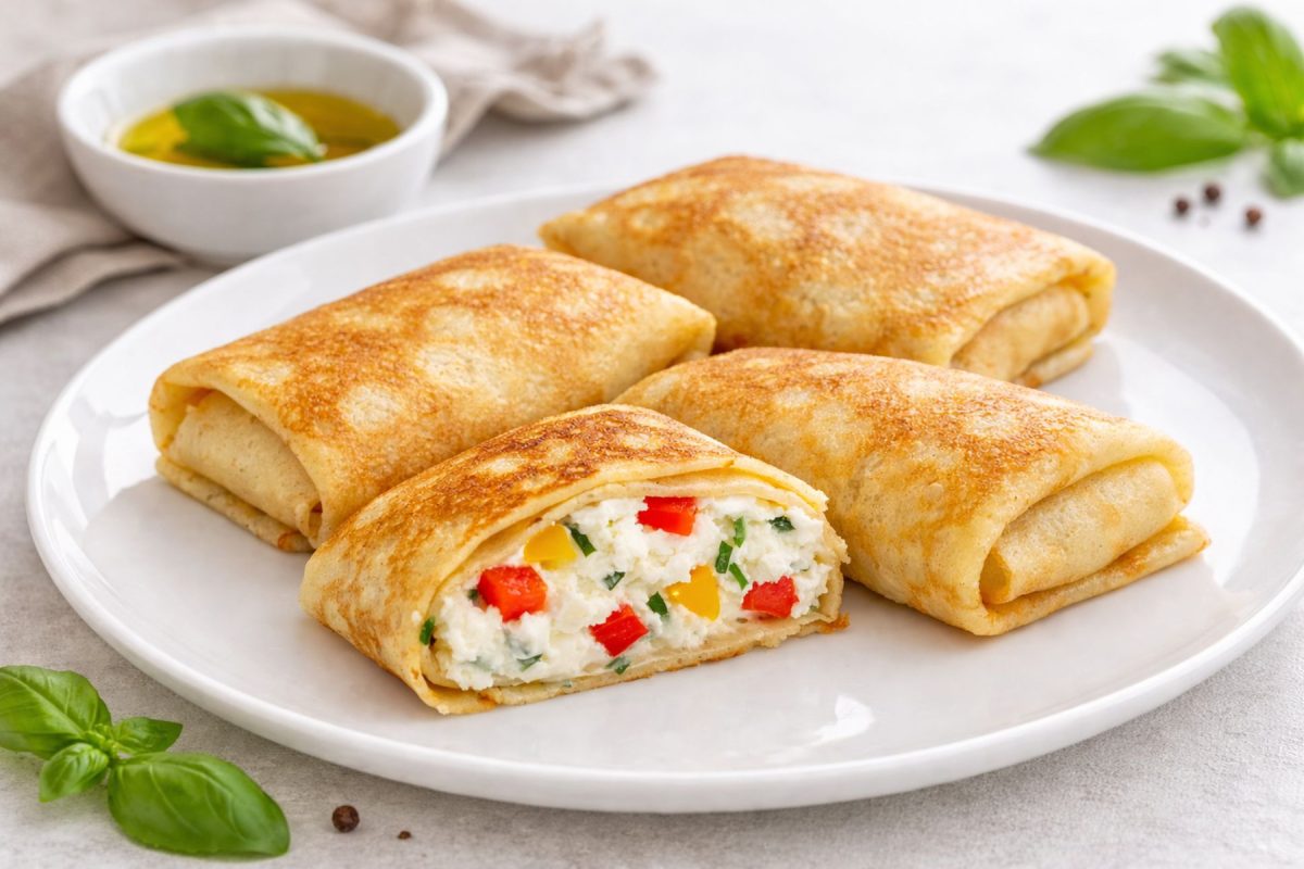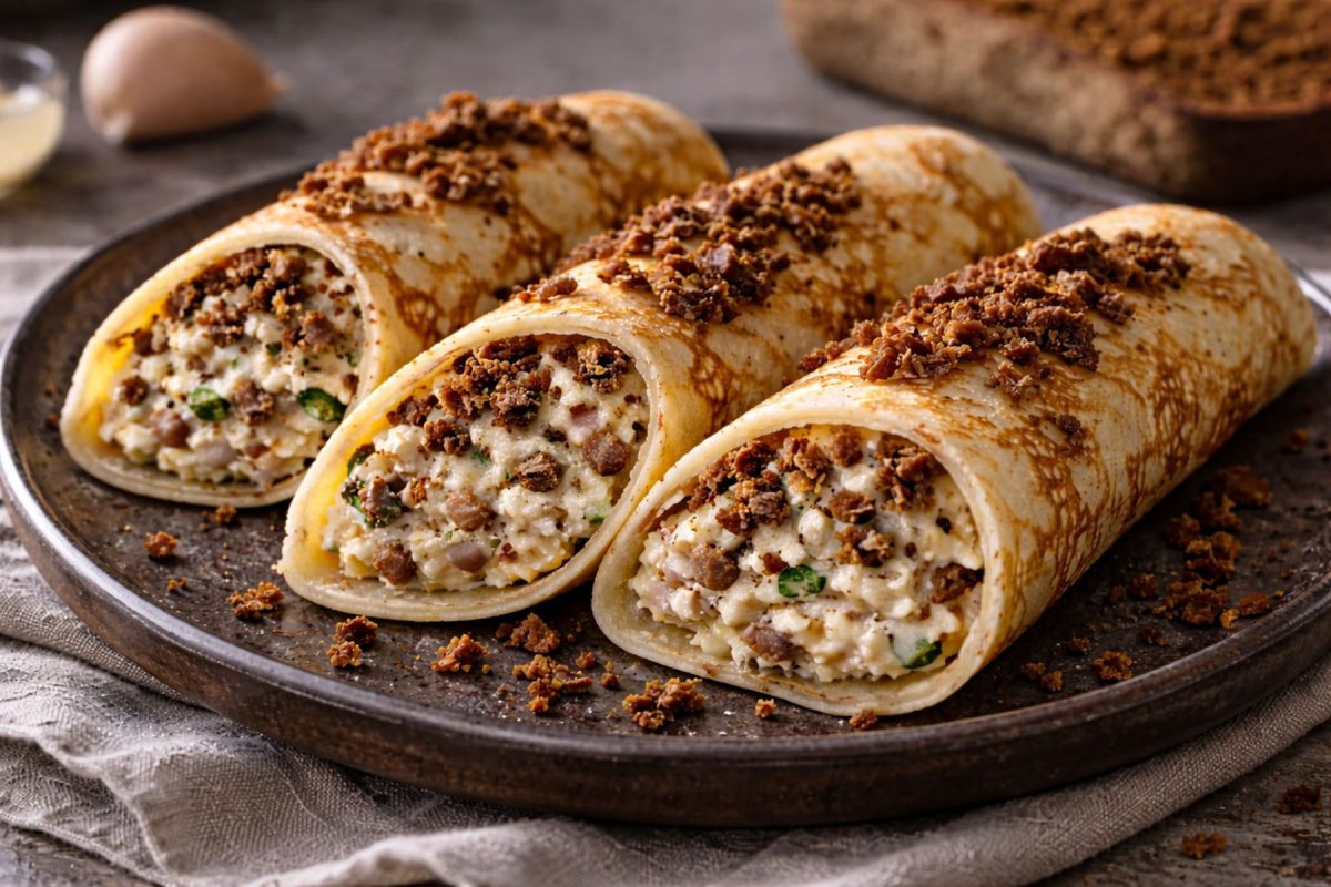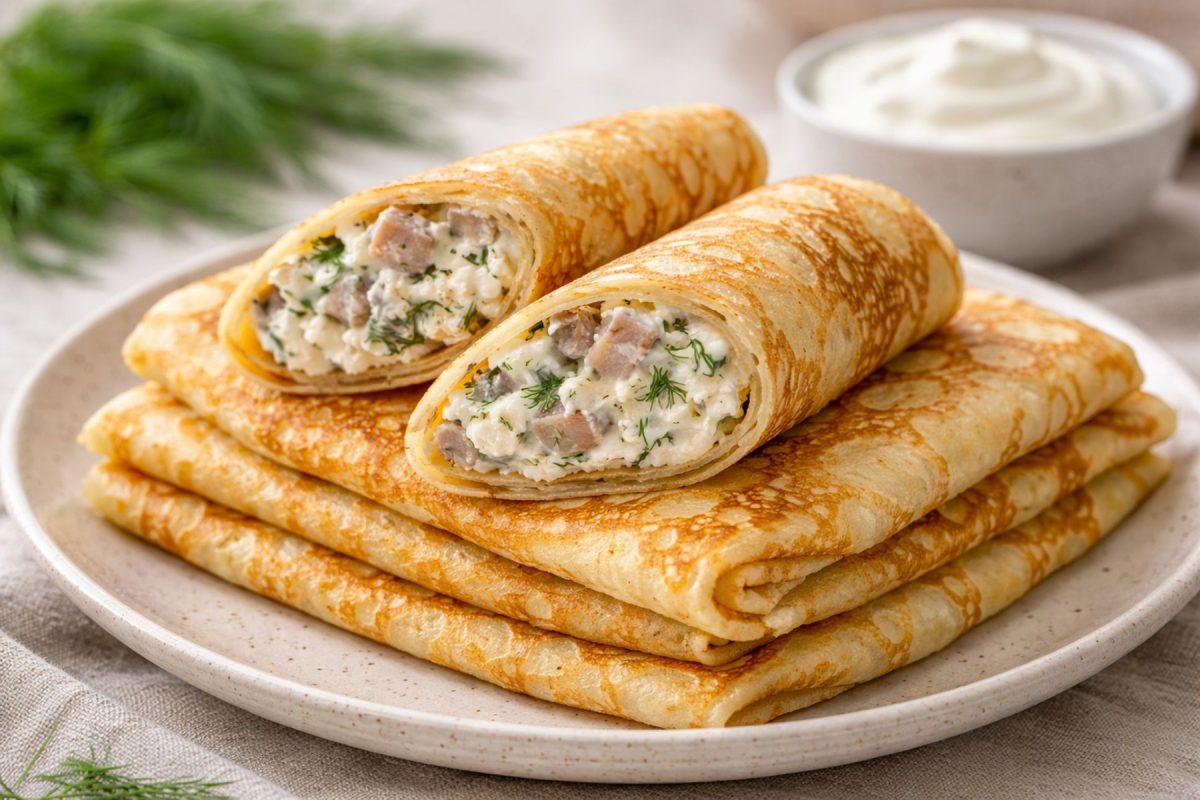 Сытный и плотный вариант, где знакомый вкус салата становится более теплым и домашним благодаря блинной оболочке. Мелкая нарезка ингредиентов здесь критически важна: начинка получается однородной, легко жуется и пропитывается соусом, не выпадая кусками при укусе.