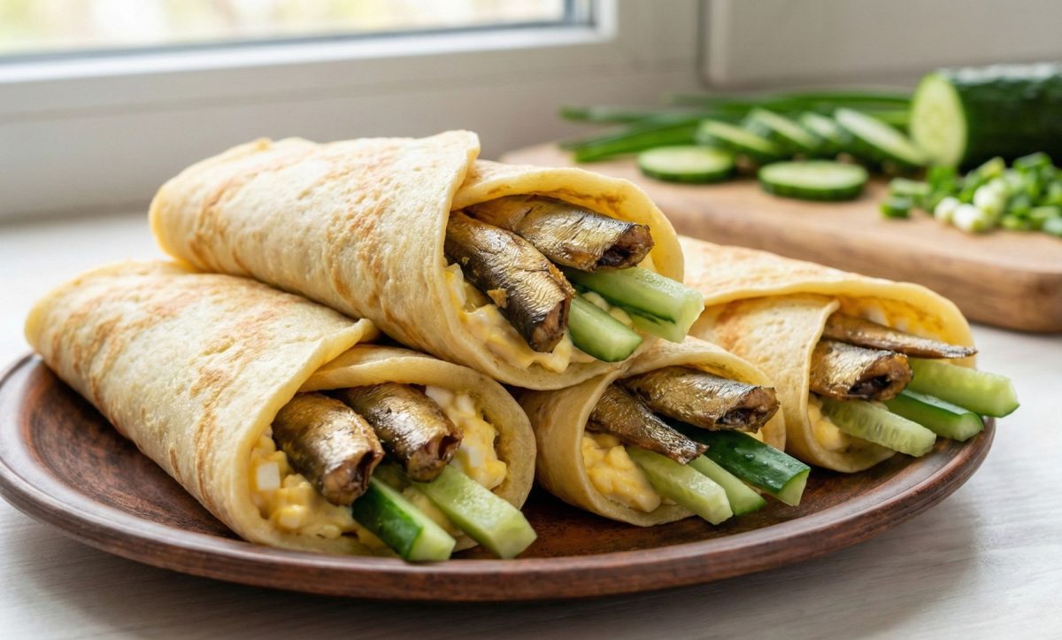 Как приготовить: Яйца натрите на терке и смешайте с майонезом и рубленым луком. Намажьте эту пасту на блин. Сверху выложите 2-3 рыбки (масло слейте) и брусочки свежего огурца для хруста. Сверните рулетом.