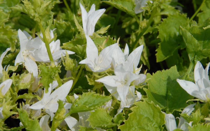 Уникальный сияюще-серебристый оттенок белого окраса очаровательных мелких цветков только усиливается благодаря тому, что пышные коврики из темной зелени на растении буквально скрыты под немыслимым количеством цветков этой летней звезды. Но и форма цветка заслуживает внимания: благодаря удлиненно-заостренным долями каждый отдельный колокольчик на растении кажется звёздочкой, что только усиливает очарование сорта.