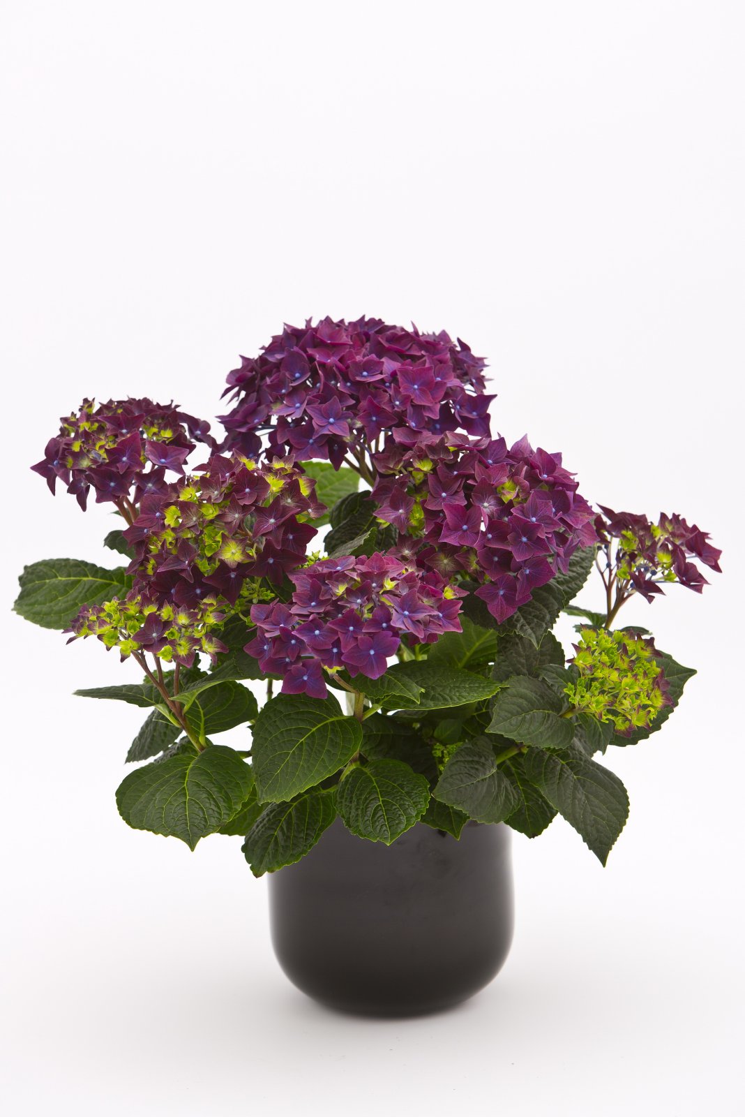 Размеры комнатных гортензий куда меньше, чем садовых, но без контроля они могут достигать полтора метра. В цветочных центрах растение часто обрабатывают ингибиторами роста, благодаря которым оно становится компактным и почти миниатюрным кустарником. Супротивно расположенные на ветвистых побегах крупные, до 15 см в длину, яйцевидные листья гортензии крупнолистной с зубчатым краем не настолько красивые, чтобы считаться украшением комнат помимо периода своего цветения.