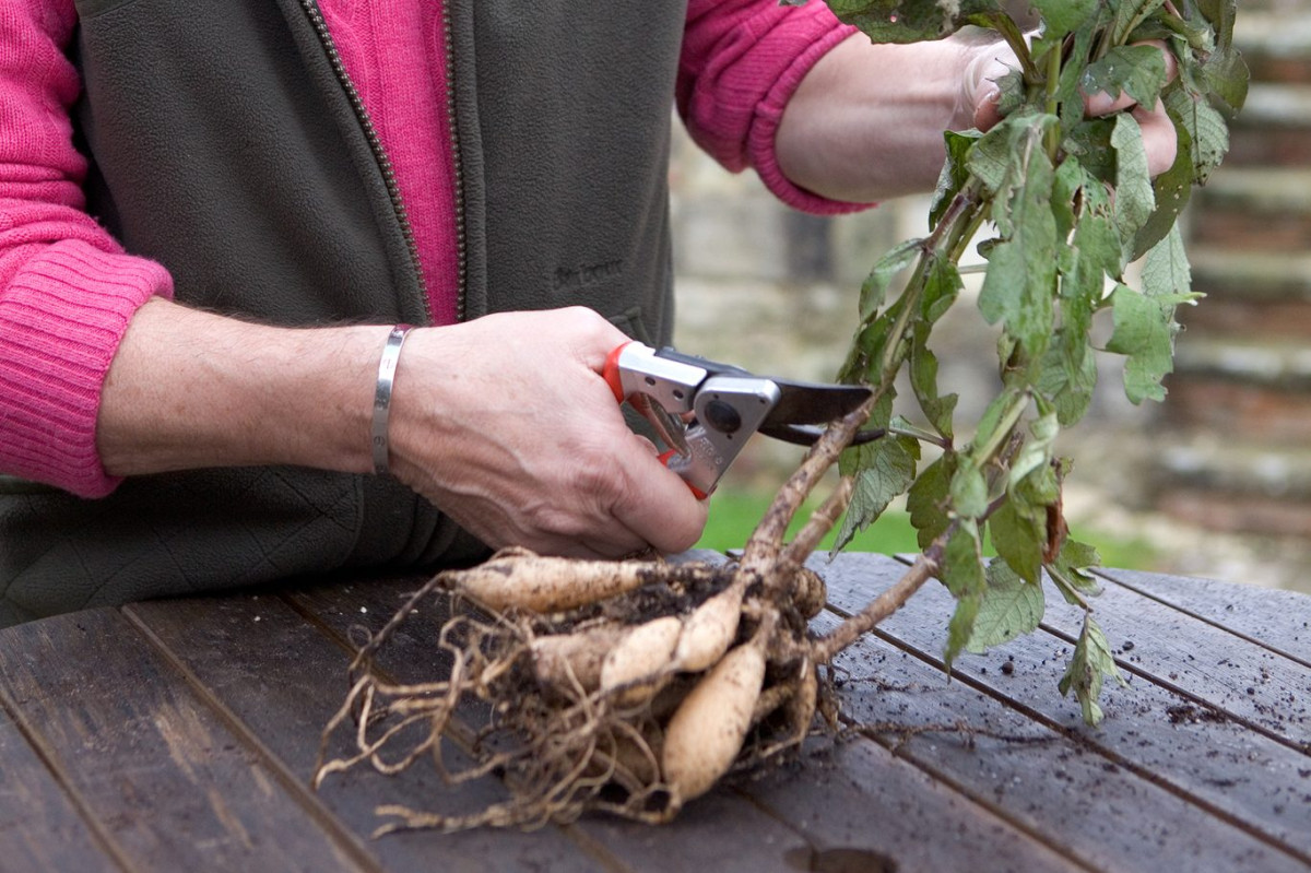 Выкапывают георгины в последних числах сентября – начале октября. Стебли предварительно срезают на высоте 4-5 см (некоторые садоводы обрезают выше). Клубни аккуратно отряхивают от земли, дезинфицируют и подсушивают. Хранят их в ящиках с песком при температуре 3-7 °С и влажности 60-75%.