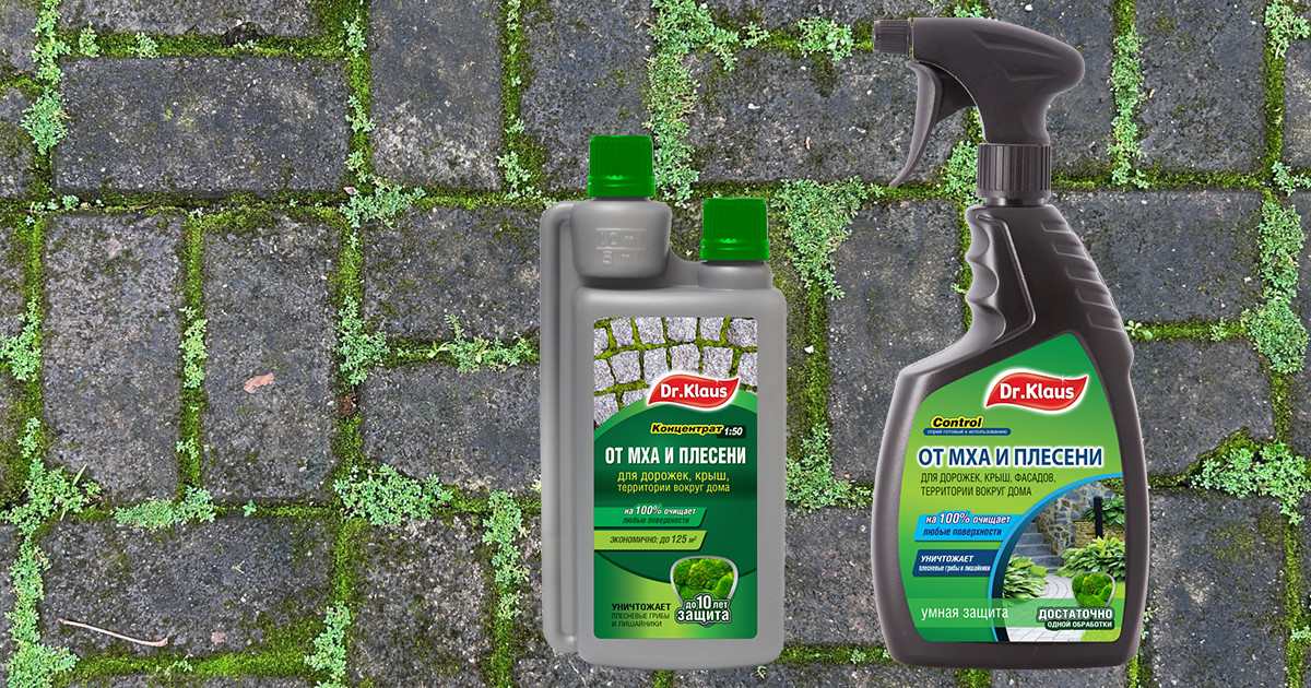 Спрей удобен для удаления мхов на относительно небольших площадях. Если приходится обрабатывать серьёзный объект, то лучше взять концентрат от мха, плесневых грибов Dr.Klaus. Одного флакона хватает, примерно, на 125 кв.м, а наносить рабочий раствор можно с помощью любого ручного опрыскивателя.