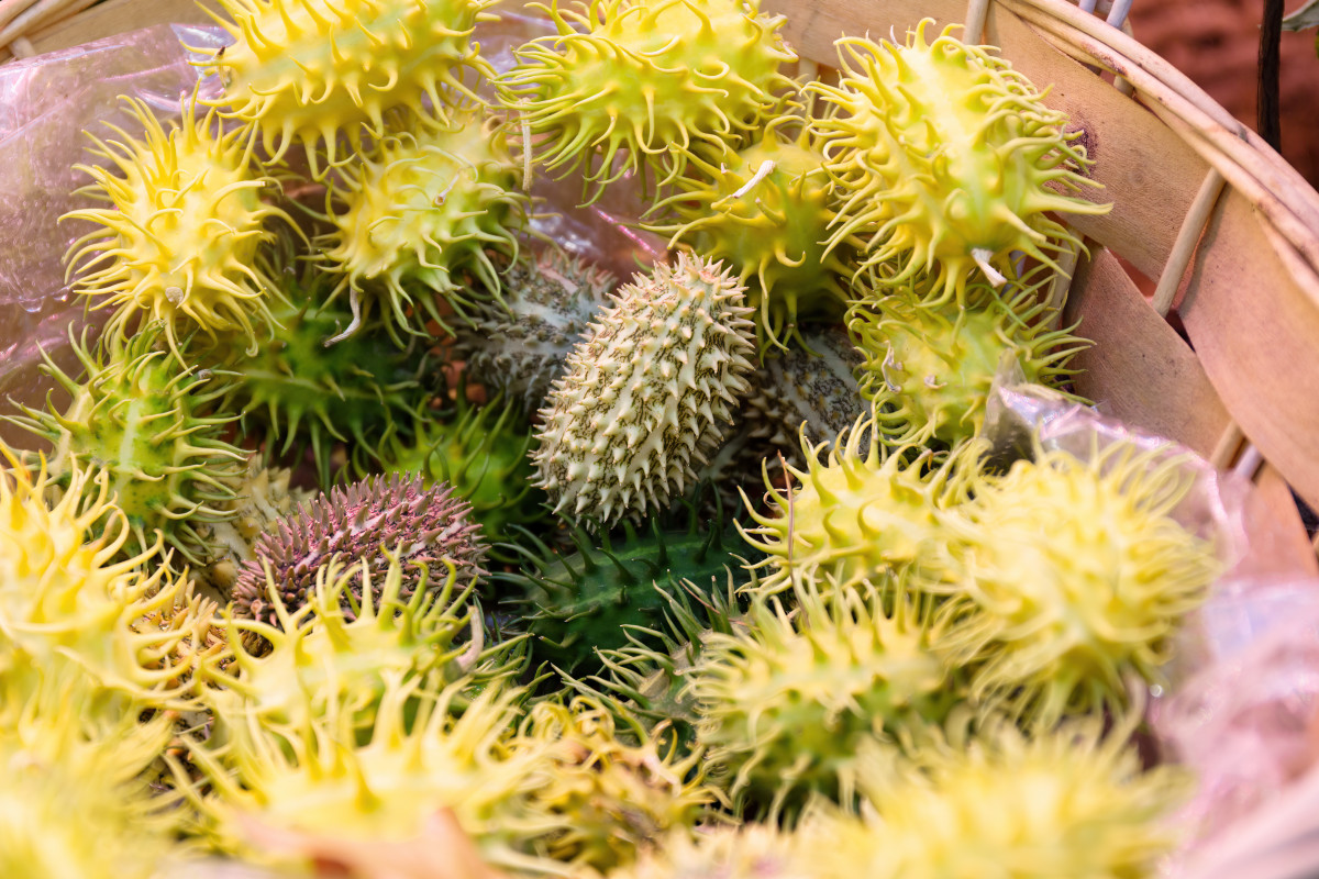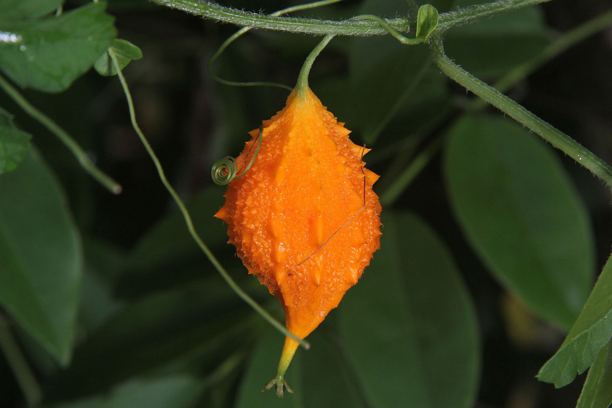 У кивано (Cucumis metulifer) есть и другие названия – рогатая дыня или огурец африканский. Это лиана длиной до 3 м с волосистым стеблем и крупными листьями. Родина экзота – Африка. Растение однодомное: женские и мужские цветки появляются на одном кусте. Выращивают кивано ради плодов. Они окрашены в оранжевый, красный, жёлтый или зелёный цвет и покрыты шипами. Длина плодов может достигать 15 см.