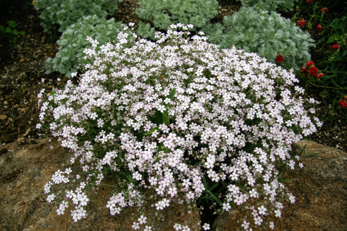 Цветение начинается рано, примерно через два месяца после всходов, и продолжается всё лето волнами. Растения образуют раскидистые кустики высотой от 30 до 60 см (в зависимости от сорта), покрытые облаком мелких цветков. Гипсофила не вытягивается, не болеет, не требует подкормок и подходит даже для самых неопытных садоводов.