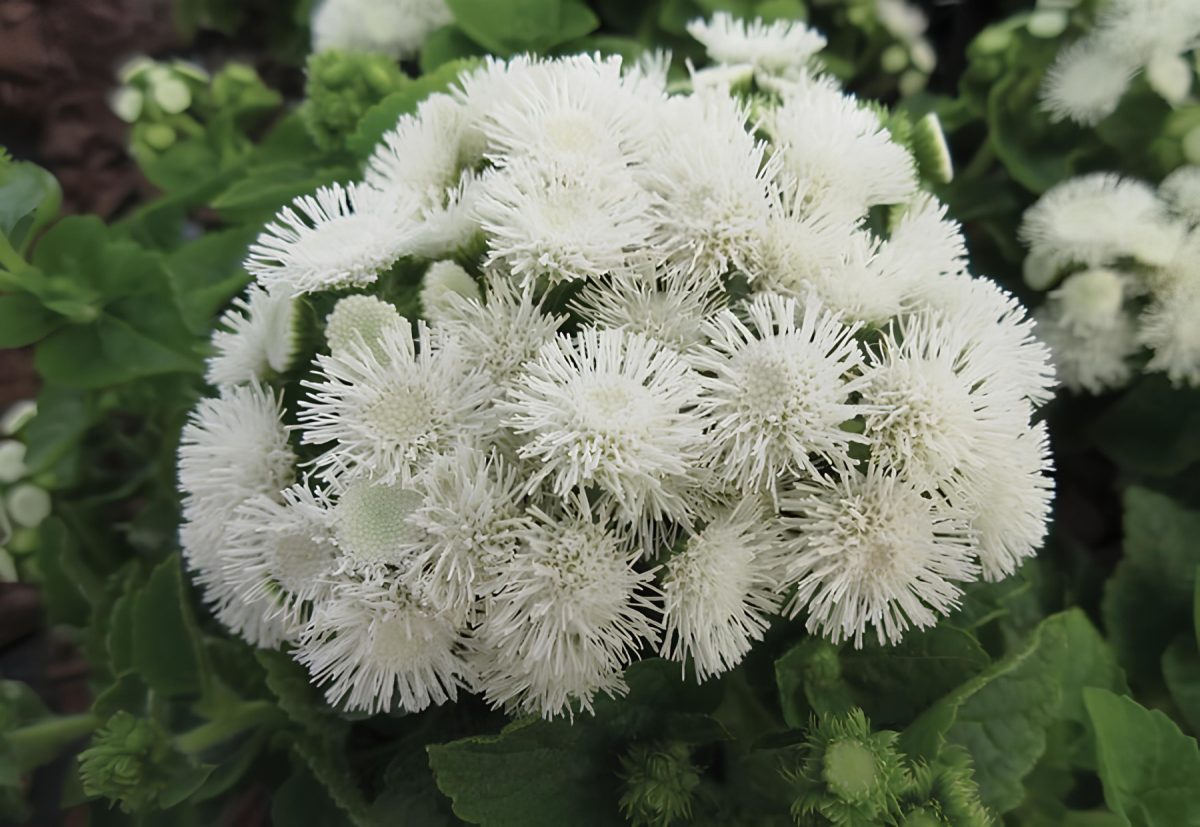 «Саммер Сноу» (Ageratum houstonianum ‘Summer Snow’) – белоснежный сорт, контрастный и нежный одновременно, высота до 20 см, идеален для композиций с яркими цветами, создаёт эффект лёгкого облака.