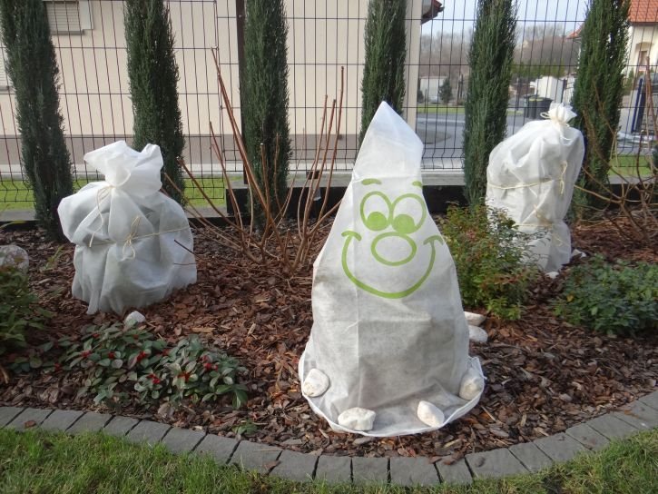 В специальных садово-огородных магазинах стала появляться сетка для укрытия хвойных растений. Это идеальный вариант – укрыл и забыл. Для тех, кто заботится об эстетике своего сада, в продаже можно найти специальные колпаки для хвойных разных размеров и форм. Они очень удобны, просто надеваются на растение и внизу затягиваются шнурком. Выполнены колпаки из специальной воздухопроницаемой ткани и имеют очень симпатичный вид.