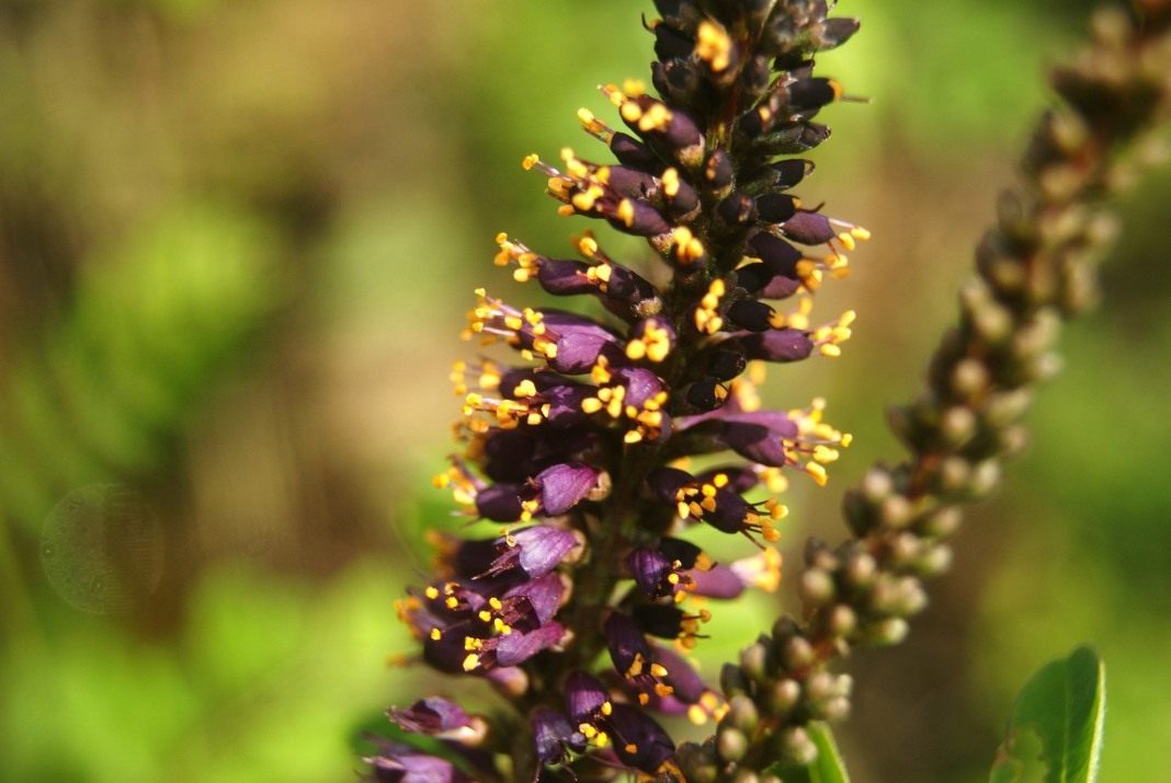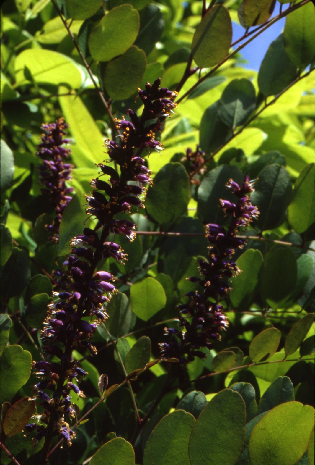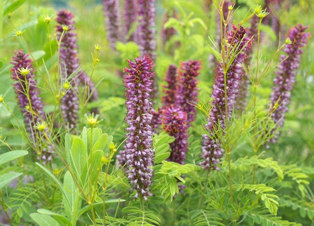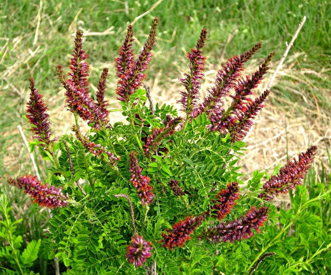 4. Аморфа серая (Amorpha canescens) достигает в высоту всего 1 метра. Ветки у нее древеснеют не полностью, но покрыты красивой серебристой опушкой, а само растение кажется стальным. Соцветия синеватые, очень своеобразные по форме.