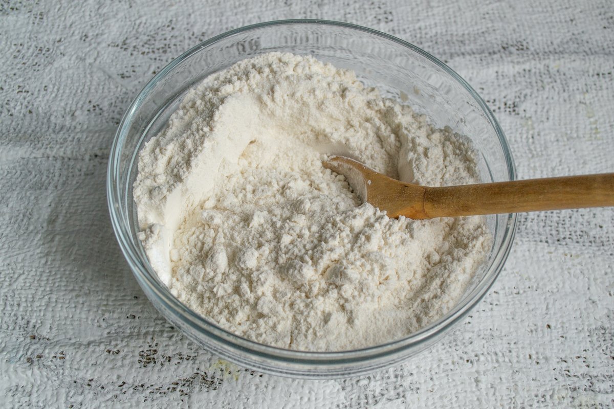 Пшеничную муку смешиваем с содой и разрыхлителем теста, просеиваем в миску, добавляем мелкий белый сахар. Тщательно перемешиваем сухие ингредиенты. Количество сахара в этом рецепте ананасового кекса можно уменьшить, так как ананасовый сироп достаточно сладкий.