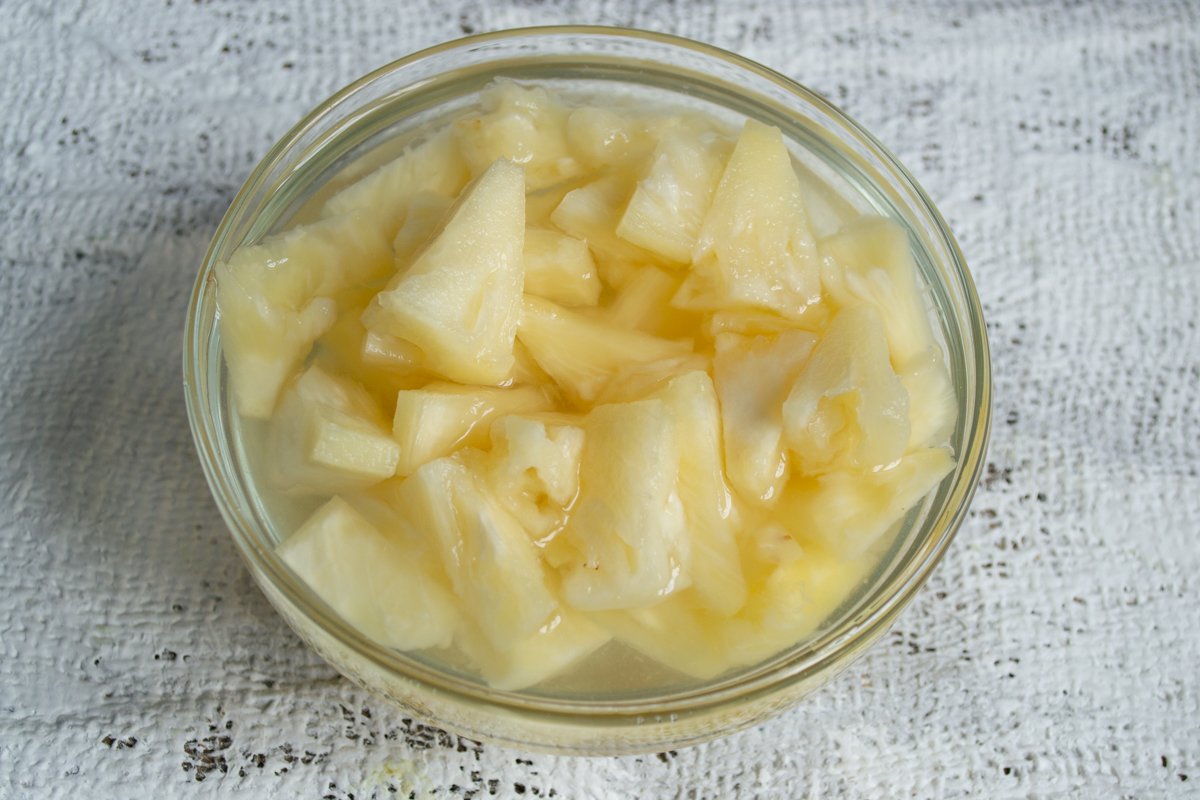 Ананасы откидываем на дуршлаг, сироп сохраняем. Кусочки фруктов или кольца режем мелко. Нарезанные фрукты и сироп снова соединяем вместе, добавляем щепотку мелкой соли.