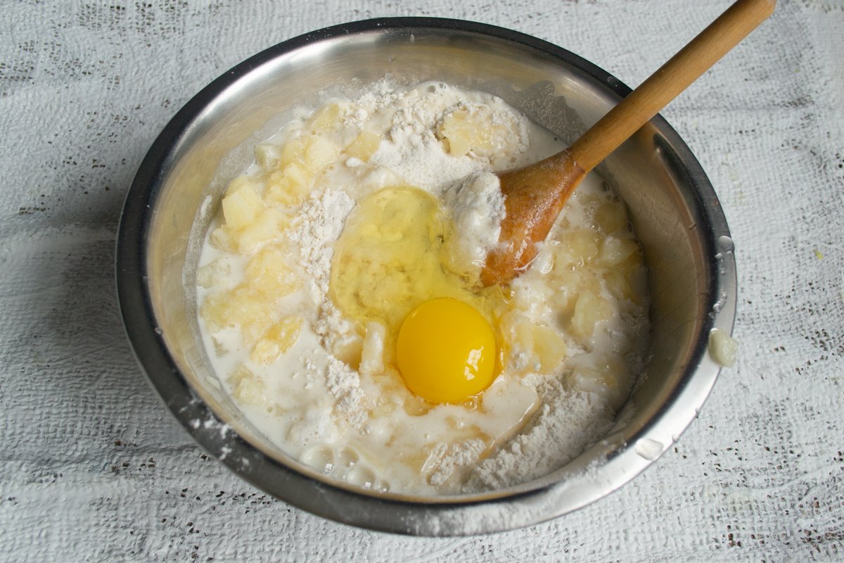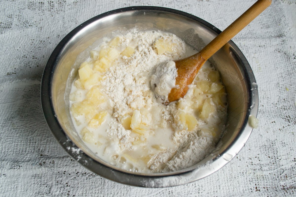 Далее соединяем сухие и жидкие ингредиенты. Кстати, тесто для ананасового кекса можно замесить в кухонном комбайне с помощью насадки «крюк», просто загружайте продукты в чашу по очереди.