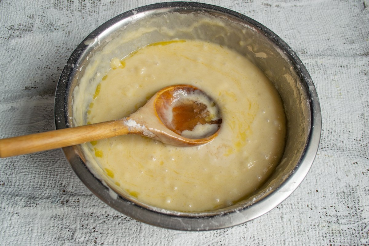 Сливочное масло растапливаем и немного остужаем. Вливаем остывшее сливочное масло в тесто, тщательно перемешиваем.